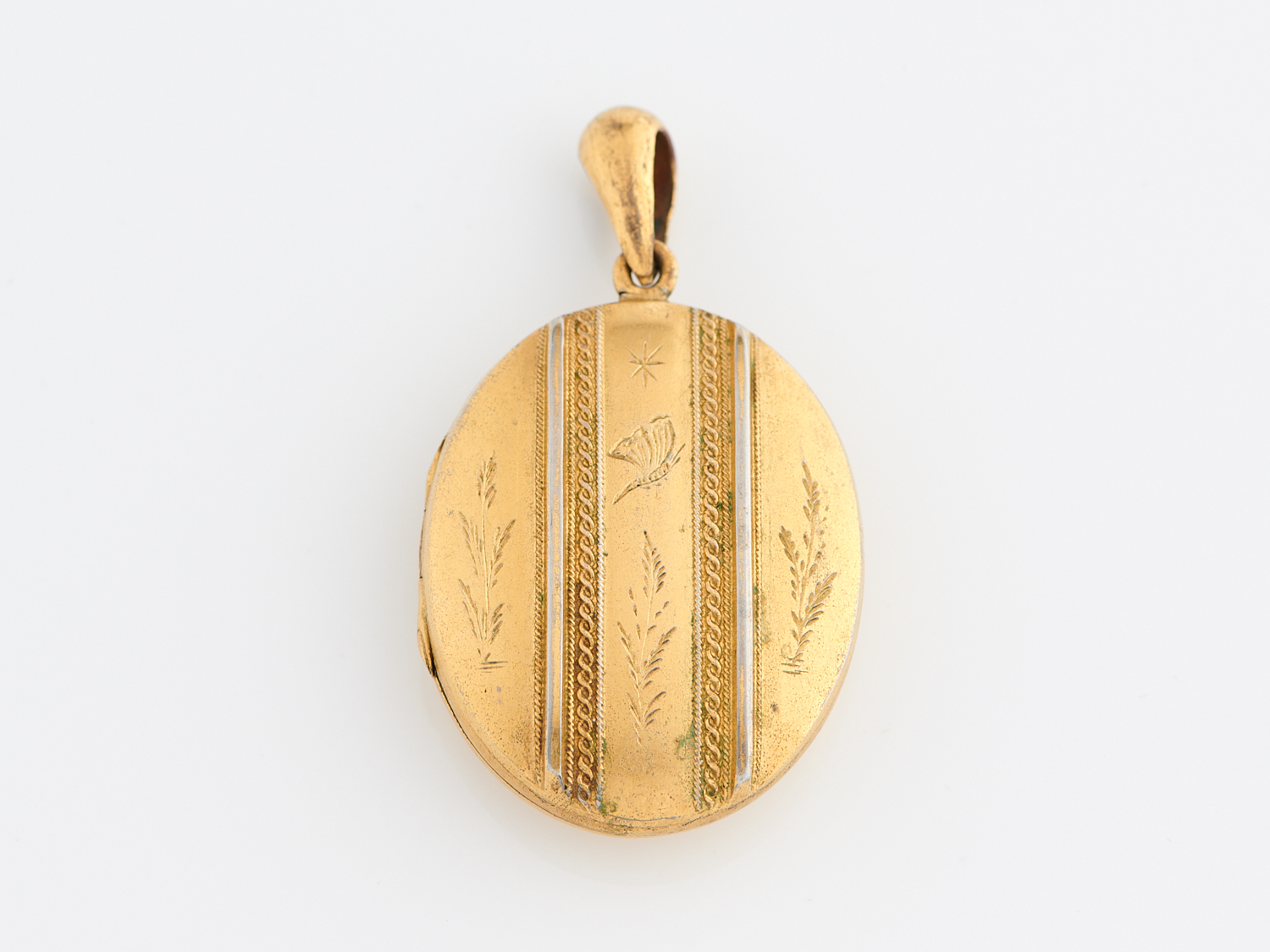 AN ENGRAVED VICTORIAN LOCKET IN SILVER GILT, 41 X 33MM