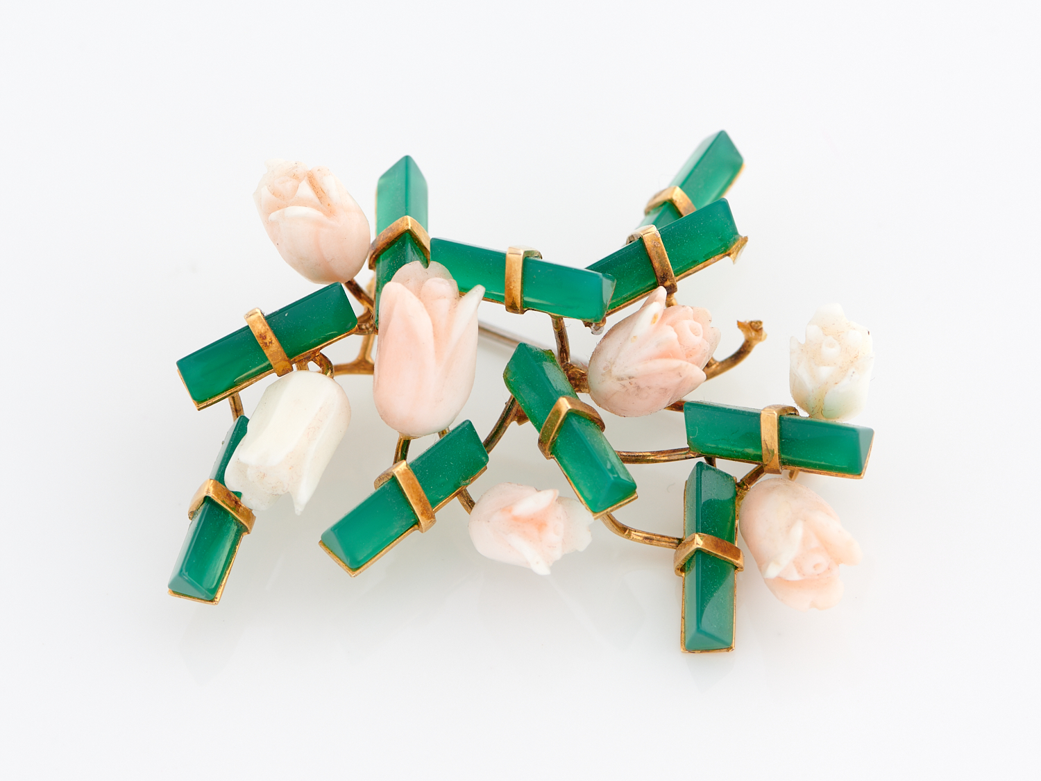 A CARVED CORAL AND GEM-SET STYLISED BOUQUET BROOCH IN 14CT GOLD, LENGTH 50MM
