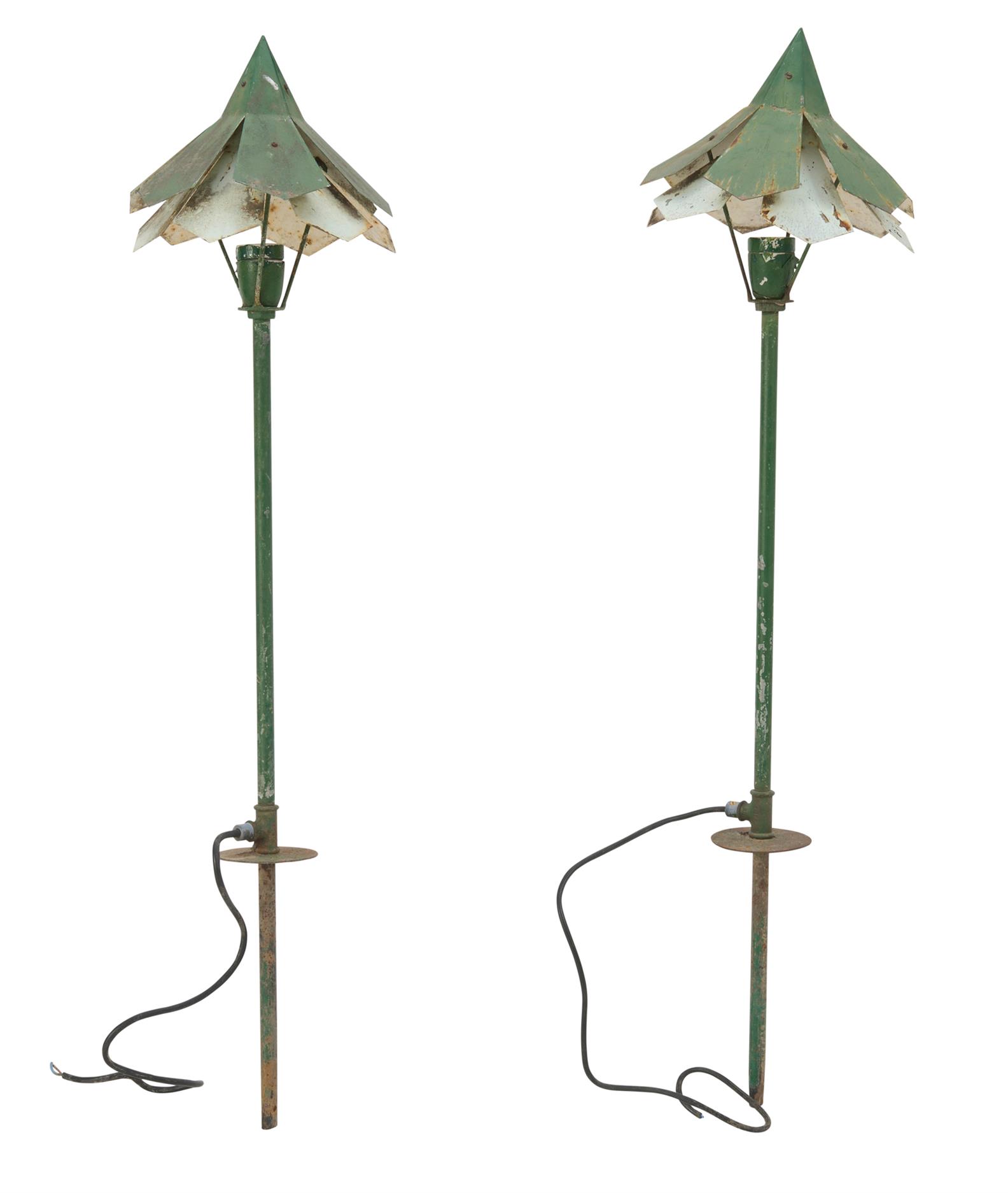 Clear signs of wear consistent with the age and previous use of the lights. Development of rust and patina to metal surfaces. Paint flaking and signs of re-painting. Electrical cords have been cut and will need to be re-wired. Would have been used as outdoor garden lights. Break to one of the ceramic bulb fittings. No missing pieces.