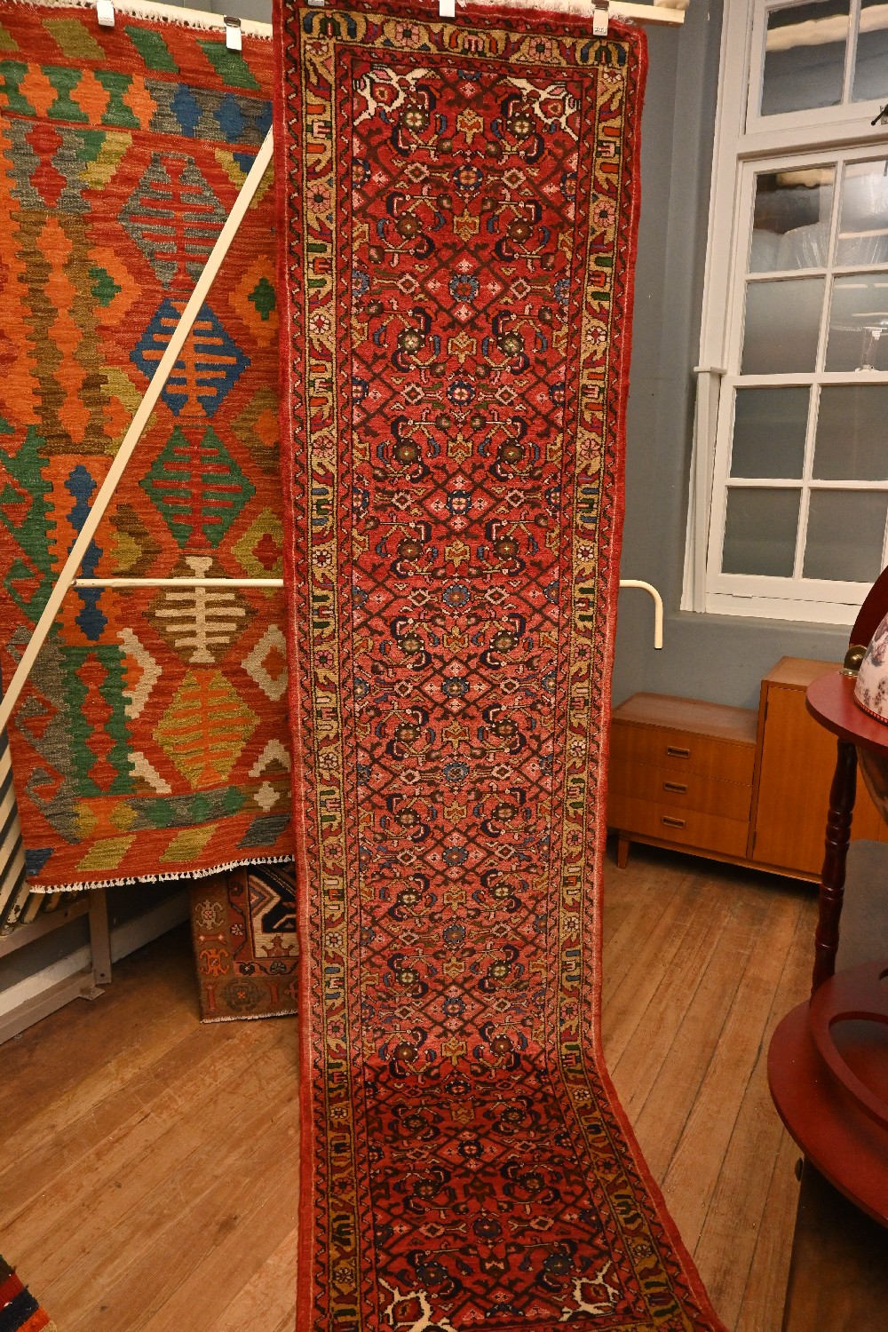 PERSIAN HOSSAINABAD RUG. 100% WOOL PILE, HARD WEARING. HAND-KNOTTED VILLAGE WEAVE FROM THE HAMADAN REGION WITH TRADITIONAL DESIGN OF ALL OVER HERATI MAHI PATTERNS IN GREEN, BLUE AND GOLD TONNES ON A SOFT RED FIELD. BORDER OF MINIATURE ROSETTES AND TRIBAL FLOWERS. SIZE: 335 X 86 CM. ORIGIN: PERSIA - RRP: $1,400. DOCUMENTATION OF AUTHENTICITY INCLUDED