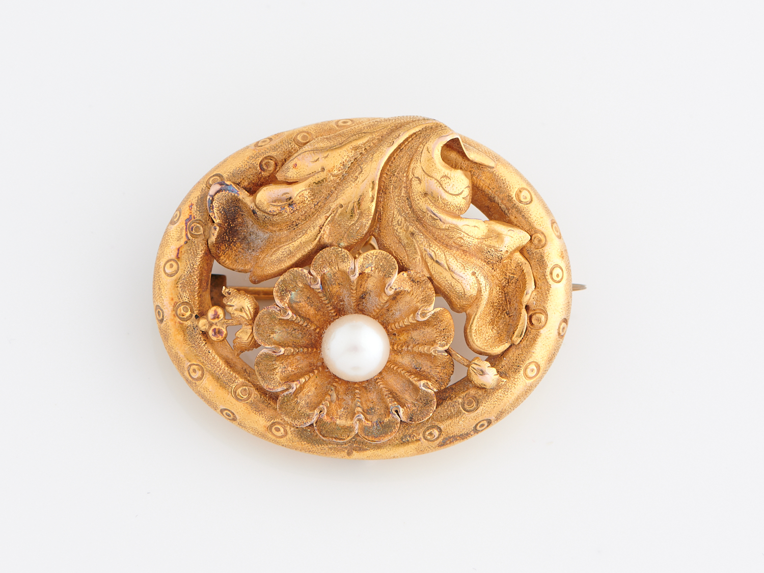 A PEARL SET FOLIATE BROOCH IN 9CT GOLD, 40 X 31MM, 5.4GMS