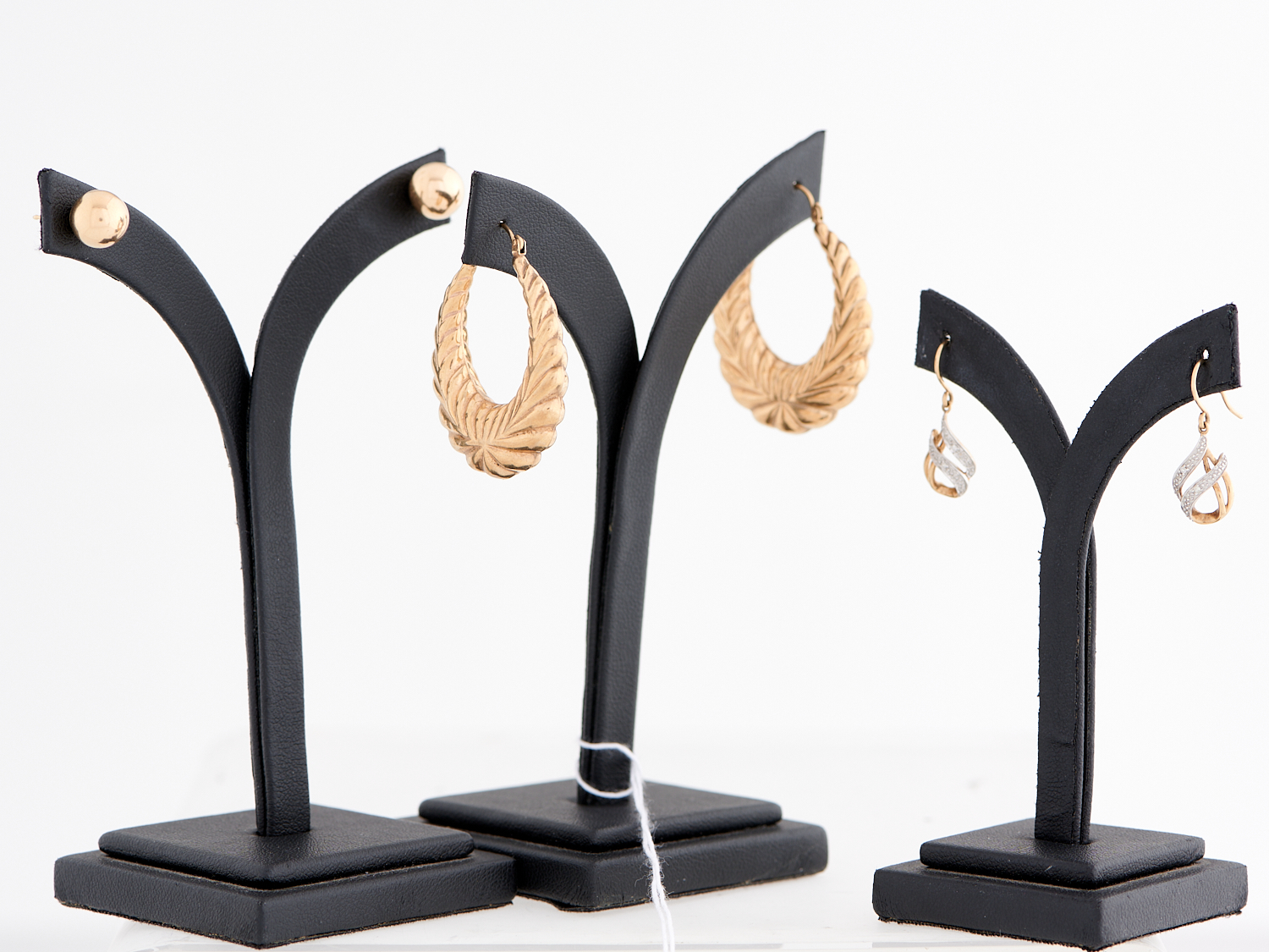 A COLLECTION OF THREE PAIRS OF EARRINGS IN 9CT AND 14CT GOLD, INCLUDING ONE DIAMOND SET, TOTAL WEIGHT 7.1GMS