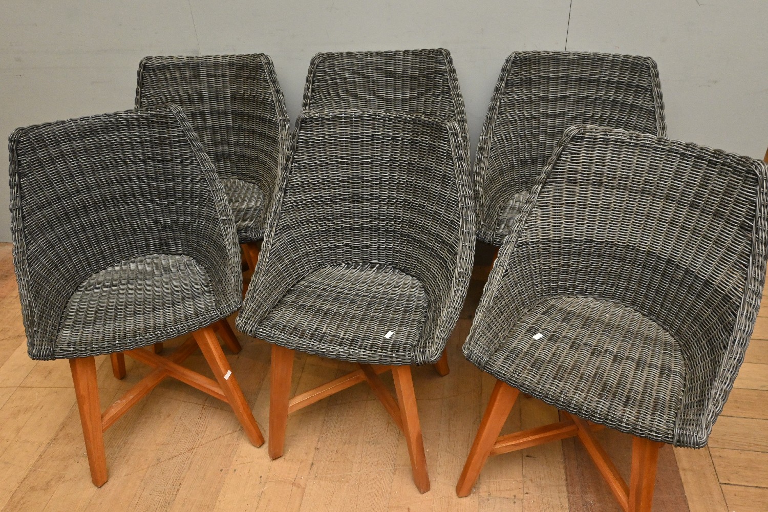 SIX TEAK AND SYNTHETIC RATTAN DINING CHAIRS (A/F) (80H X 47W X 50D CM) (LEONARD JOEL DELIVERY SIZE: X-LARGE)