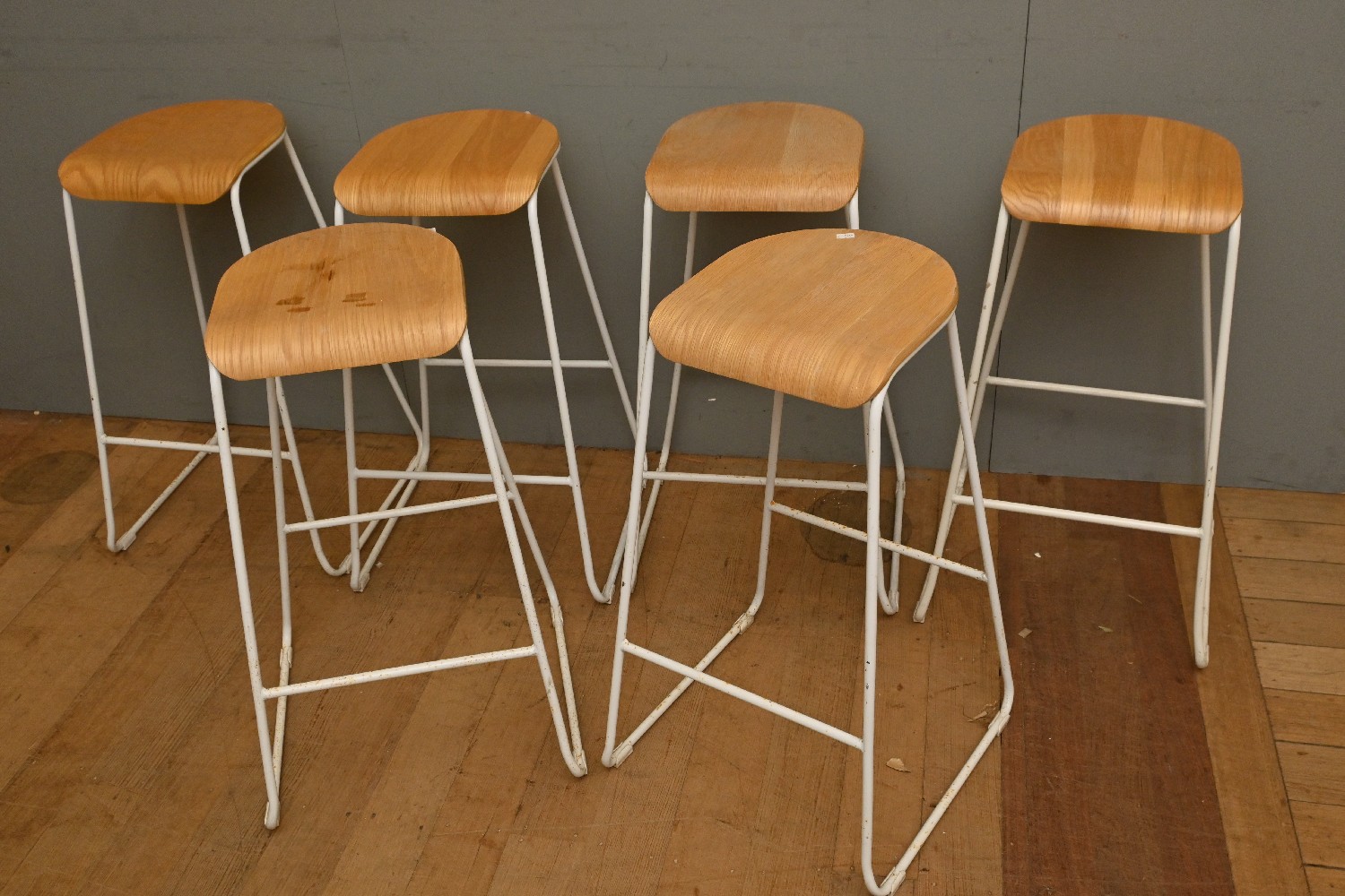 SET OF SIX CONTEMPORARY BAR STOOLS, WHITE POWDER COATED METAL WITH TIMBER SEAT (A/F) (71H X 44W X 43D CM) LEONARD JOEL DELIVERY SIZE: X-LARGE