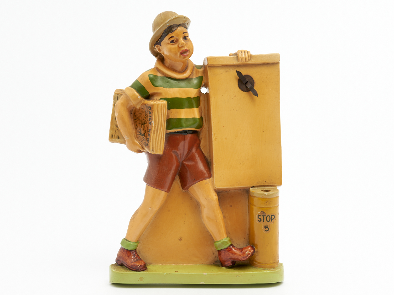 AN AUSTRALIAN MADE HANDPAINTED POTTERY RINA FIGURAL NOTEPAD HOLDER IN THE FORM OF A PAPER SELLER H.27CM, LEONARD JOEL LOCAL DELIVERY: SMALL