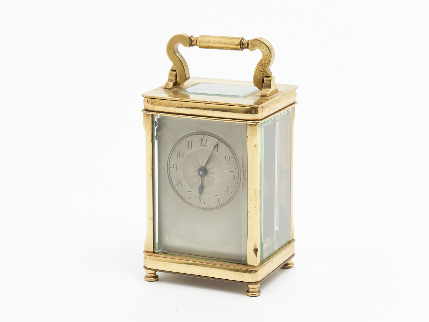 A 19TH CENTURY ENGLISH SOLID BRASS CARRIAGE CLOCK WITH SILVERED DIAL AND KEY (A/F) H.12CM, LEONARD JOEL LOCAL DELIVERY: SMALL