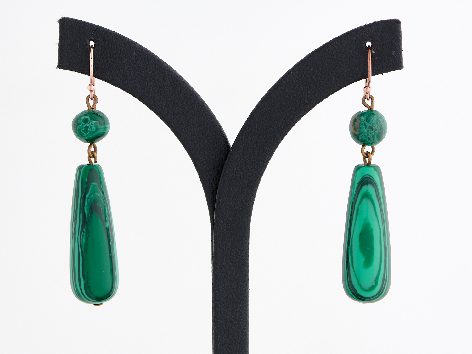 A PAIR OF SIMULATED MALACHITE PENDANT EARRINGS, TO SHEPHERD HOOK FITTINGS IN GOLD PLATE