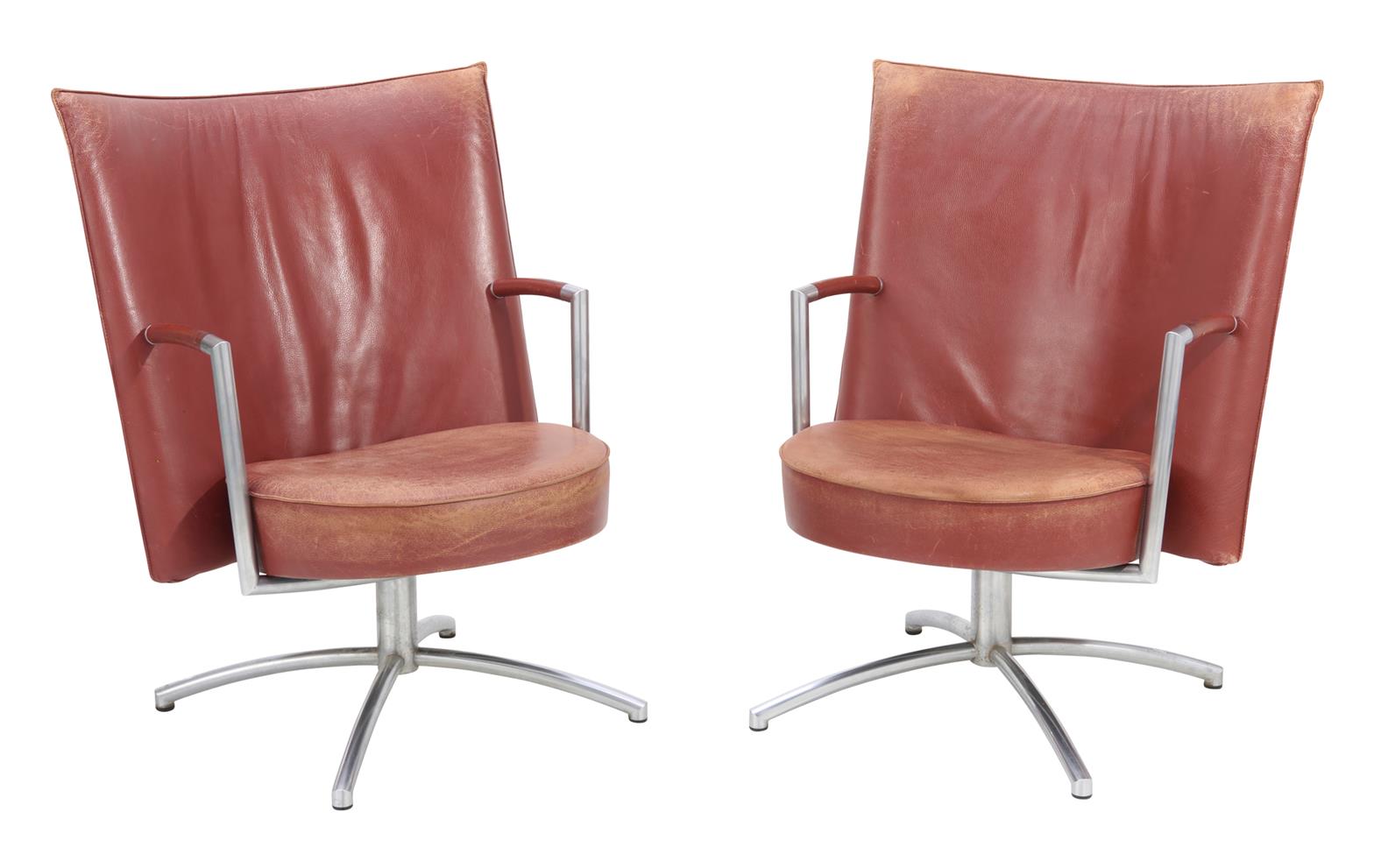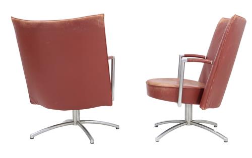 Red leather on stainless steel frames. Swivel returning four star bases.
