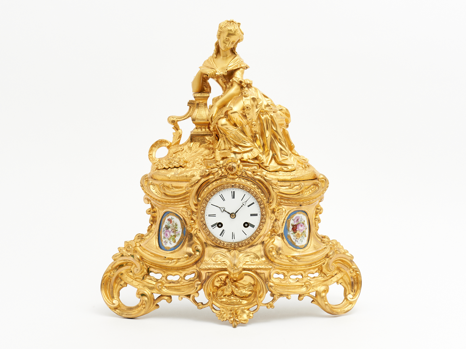 A NAPLEON III GILDED MANTEL CLOCK WITH PORCELAIN INSETS C.1880 43 X 39 X 10CM, LEONARD JOEL LOCAL DELIVERY: MEDIUM