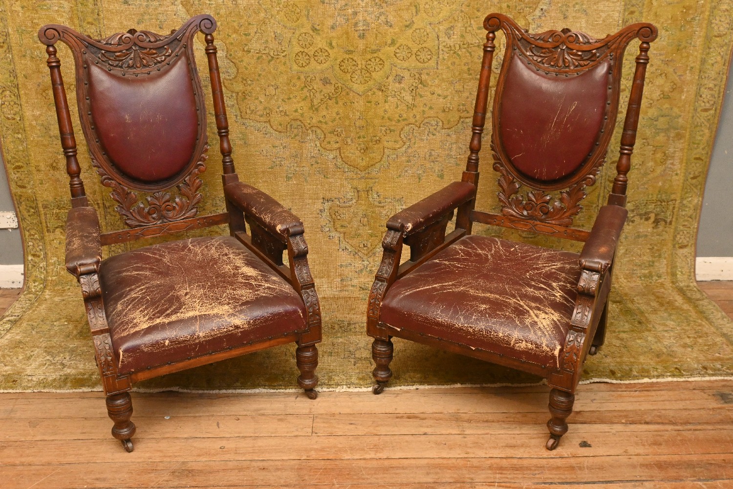 A PAIR OF LATE VICTORIAN BLACKWOOD AND UPHOLSTERED ARMCHAIRS (A/F) (113H X 73H X 76D CM) (PLEASE NOTE THIS HEAVY ITEM MUST BE REMOVED BY CARRIERS AT THE CUSTOMER'S EXPENSE. LEONARD JOEL STAFF CANNOT ASSIST CARRYING THIS ITEM) (X-LARGE ITEM)