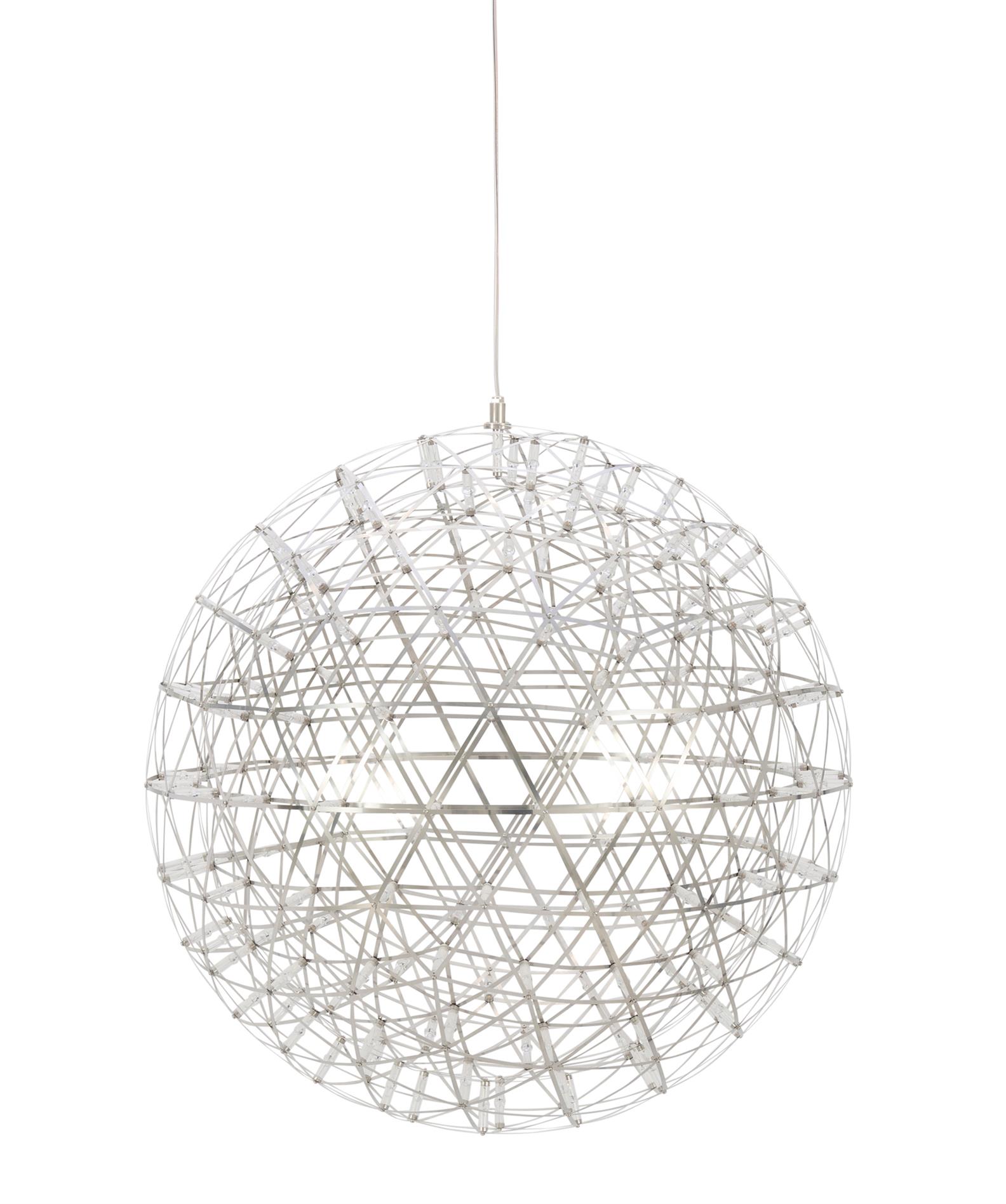 Stainless steel geodesic sphere with Led bulbs. Manufacturers sticker to ceiling mount.