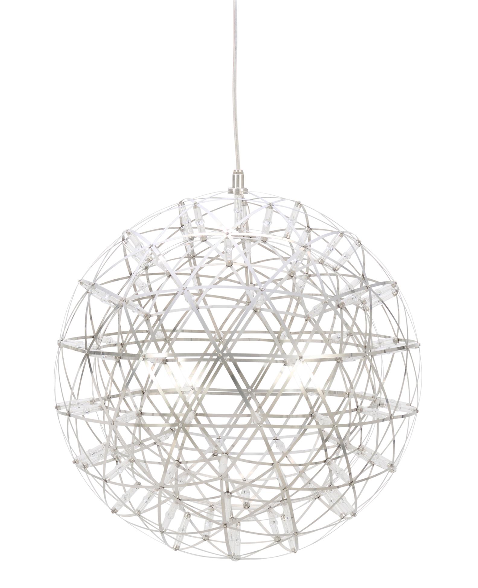 Stainless steel geodesic sphere with LED bulbs. Manufacturers sticker to ceiling mount.