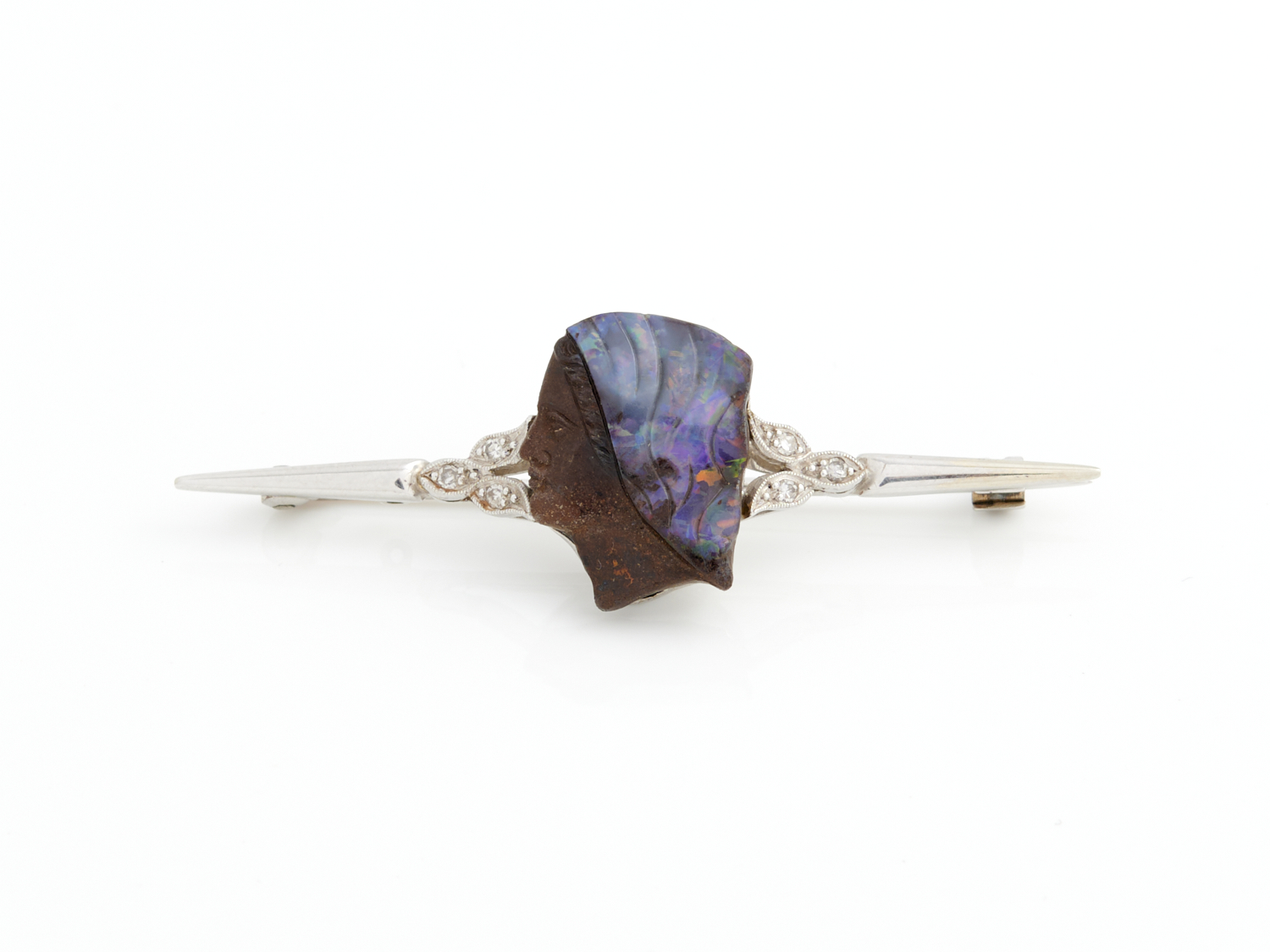 A CARVED BOULDER OPAL AND DIAMOND SET BROOCH IN 18CT WHITE GOLD, 50MM, 5.2GMS