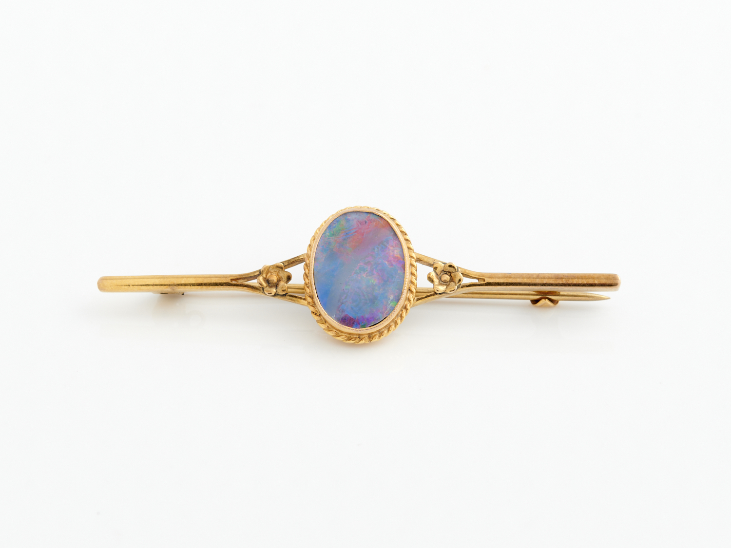A VINTAGE OPAL DOUBLET SET BROOCH IN 9CT GOLD, LENGTH 56MM