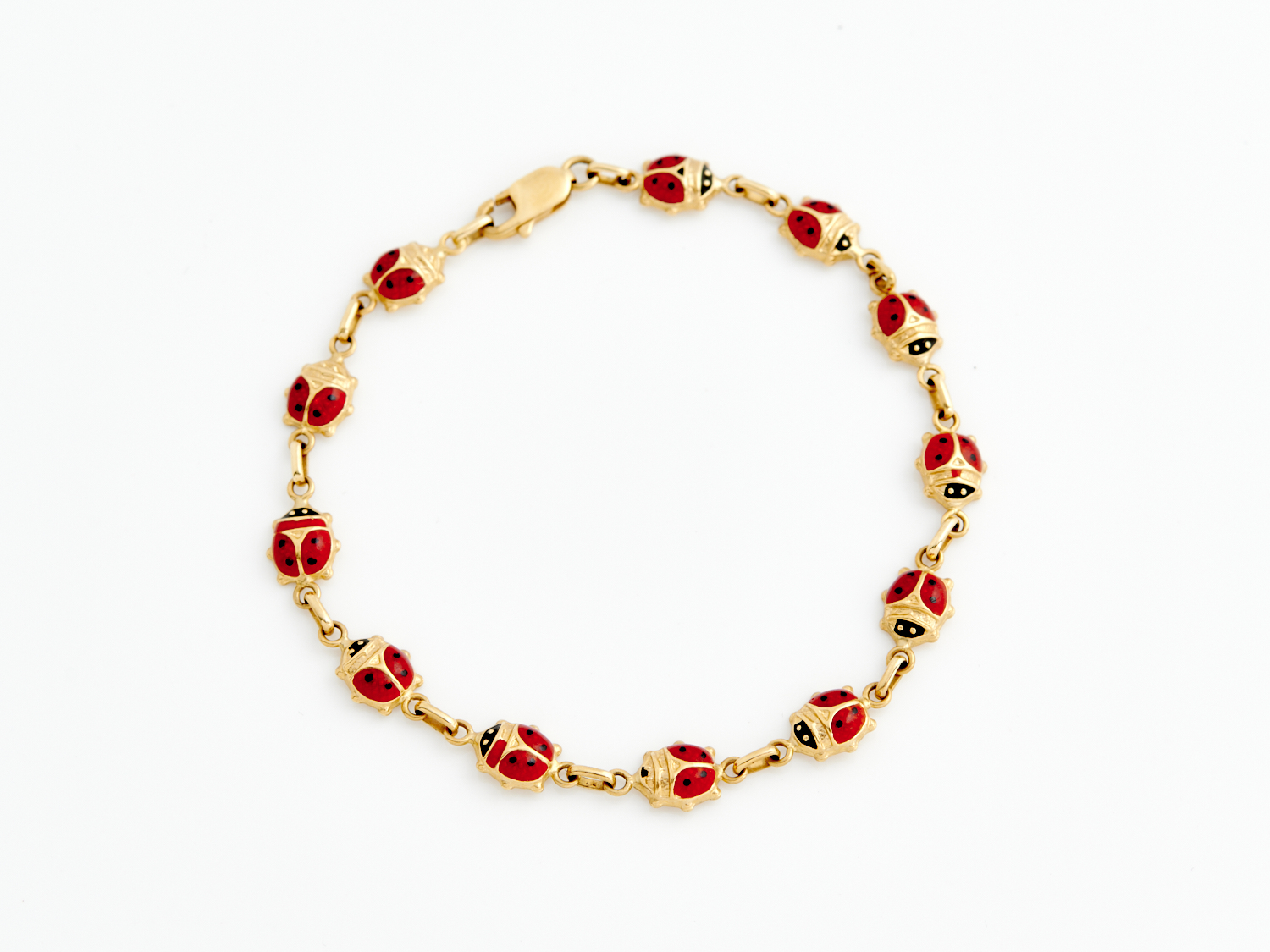 AN ITALIAN ENAMELLED LADY BUG BRACELET IN 18CT GOLD, 180MM, 5.3GMS