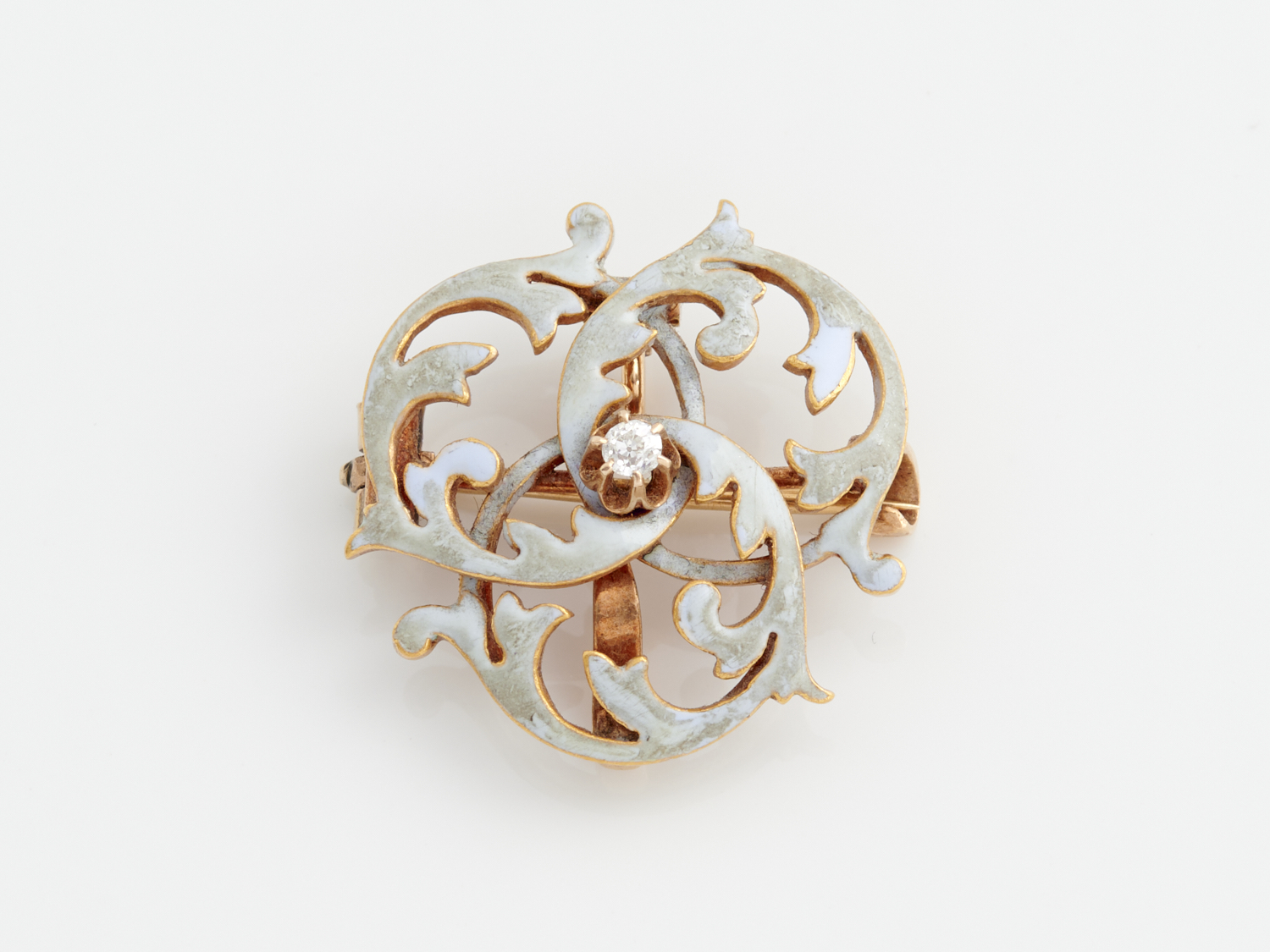 A VICTORIAN ENAMEL AND DIAMOND SET ENHANCER/BROOCH IN 9CT GOLD, 25 X 25MM