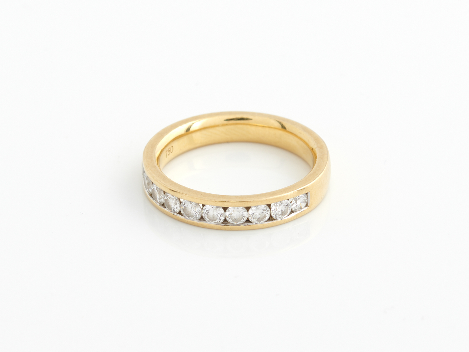 A CHANNEL SET DIAMOND BAND IN 18CT GOLD, THE DIAMONDS TOTALLING APPOXIMATELY 0.53CTS, RING SIZE K, 4.1GMS, ACCOMPANIED BY A VALUATION