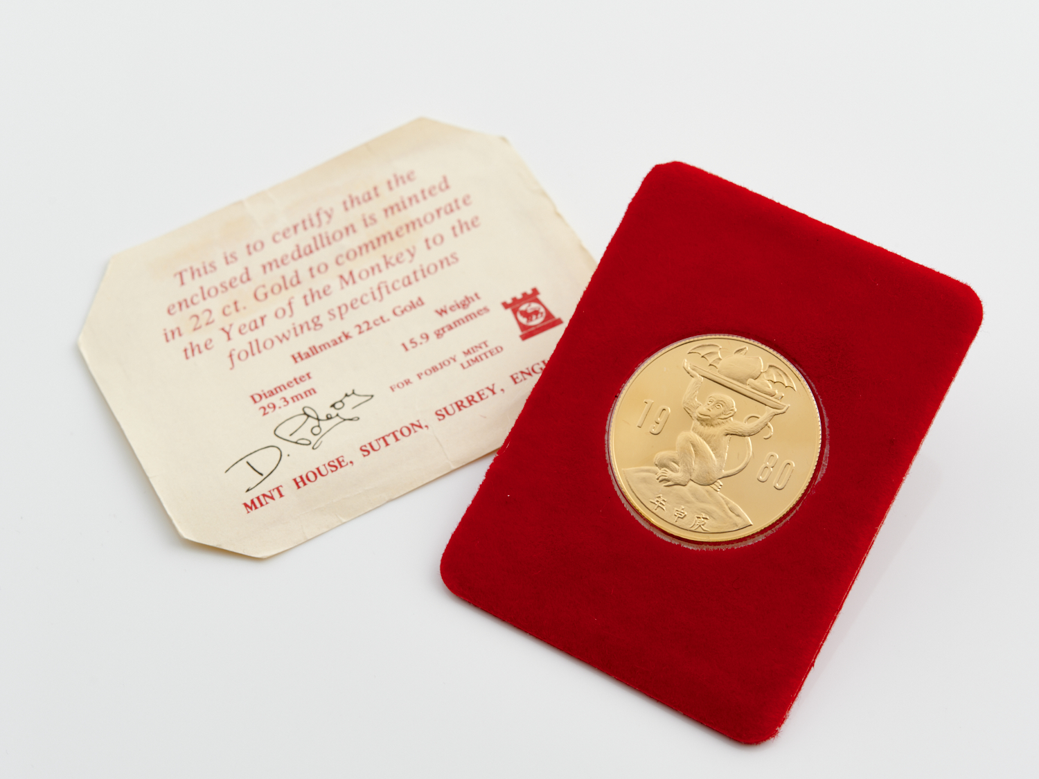A 1980 YEAR OF THE MONKEY MEDALLION IN 22CT GOLD, DIAMETER 29.3MM, 15.9GMS, ACCOMPANIED BY CERTIFICATE OF ISSUE