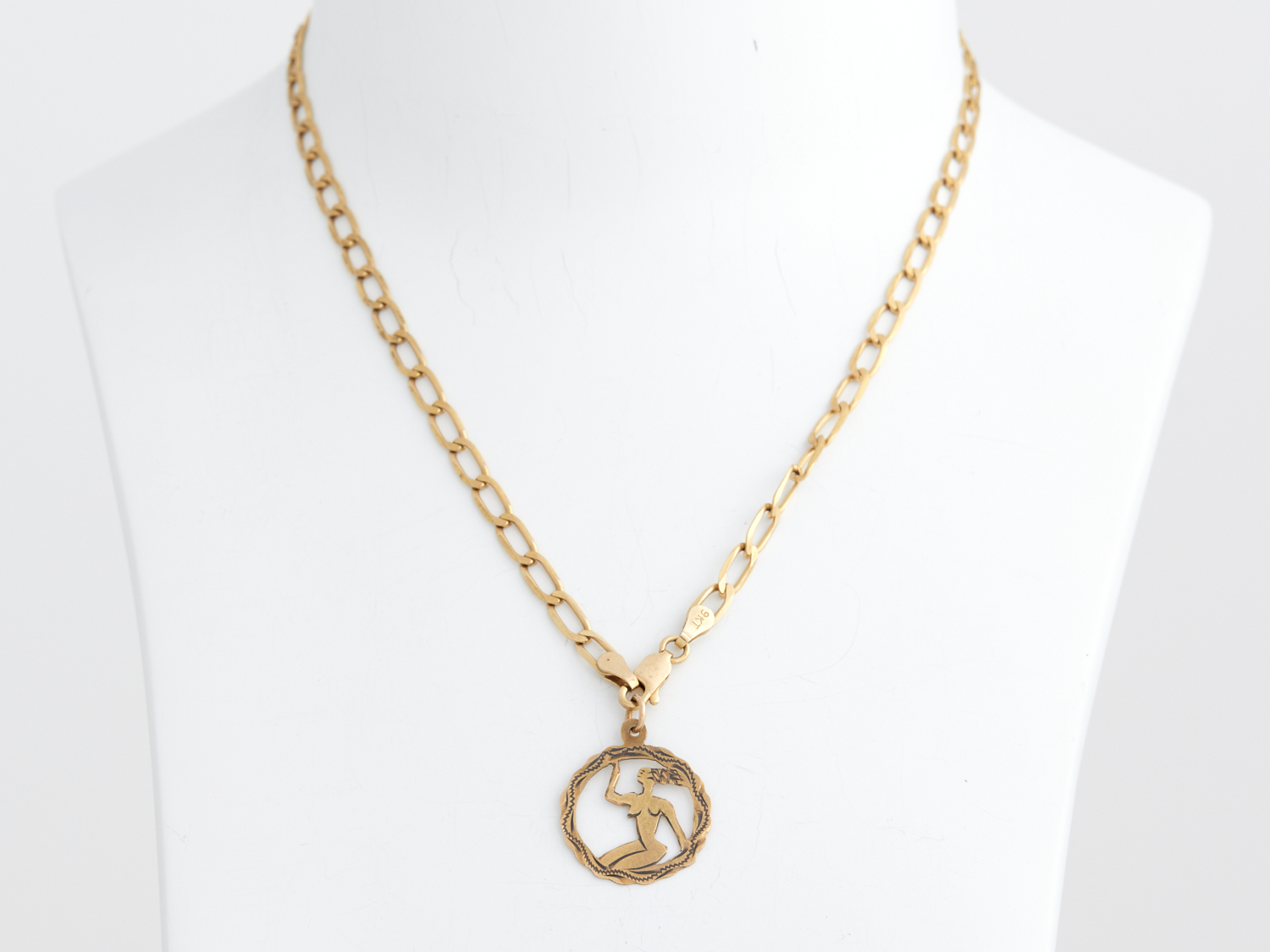 A ROUND OPEN WORK PENDANT IN 9CT GOLD, TOGETHER WITH A FLAT CURB LINK CHAIN 9CT GOLD, THE PENDANT MEASURING 20MM DIAMETER, THE CHAIN LENGTH 420MM, 8.4GMS