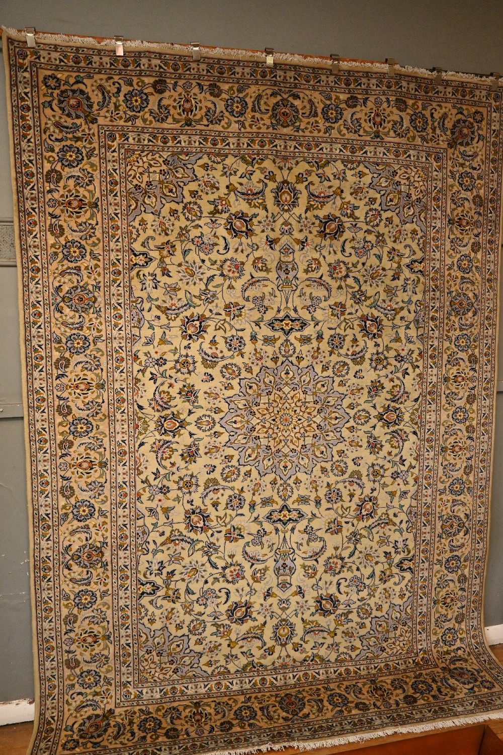 A PERSIAN PISTACHIO KASHAN CARPET, 100% WOOL PILE, SOLID AND DENSELY HAND KNOTTED. TRADITIONAL DESIGN OF A CENTRAL ELONGATED MEDALLION IN SOFT TONES OF FRENCH BLUE, CREAM & PEACH. ALL OVER SHA ABBASI PALMETTES, FLORAL SPRAYS AND TENDRILS. IN TONES OF CHAMPAGNE AND FRENCH BLUE, COGNAC WITH A HINT OF GREEN. SIZE: 354 X 250 CM. ORIGIN: PERSIA - RRP: $5,900. DOCUMENTATION OF AUTHENTICITY INCLUDED