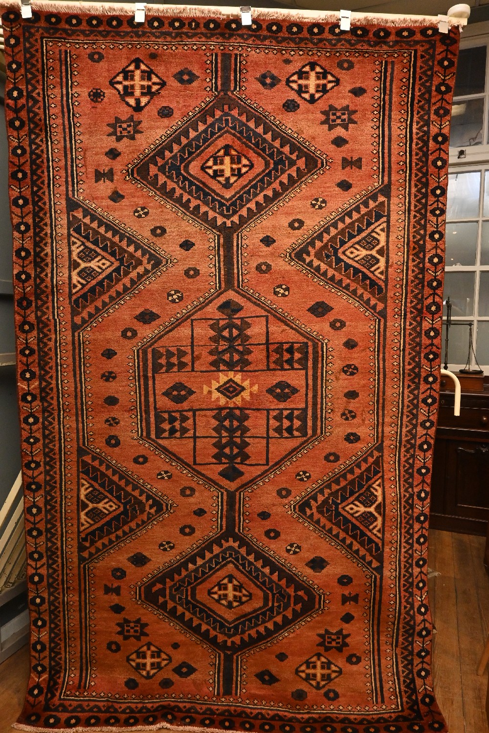A PERSIAN TRIBAL BEHBAHANI OOLAD RUG, CIRCA 1970S. 100% WOOL, NATURAL DYES. TRIPLE POLE MEDALLION ON A SOFT RED FIELD CONTAINING ROSETTES AND GEOMETRICAL DIAMOND MOTIFS. SOFT MUTED TONES. SIZE: 255 X 154 CM
