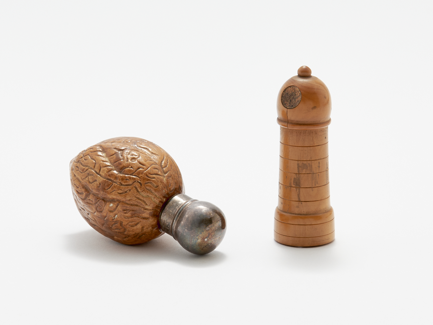 A RARE WALNUT-FORM SCENT BOTTLE AND A TREEN CASED SCENT BOTTLE, THE WALNUT 8.5CM LONG, LEONARD JOEL LOCAL DELIVERY: SMALL