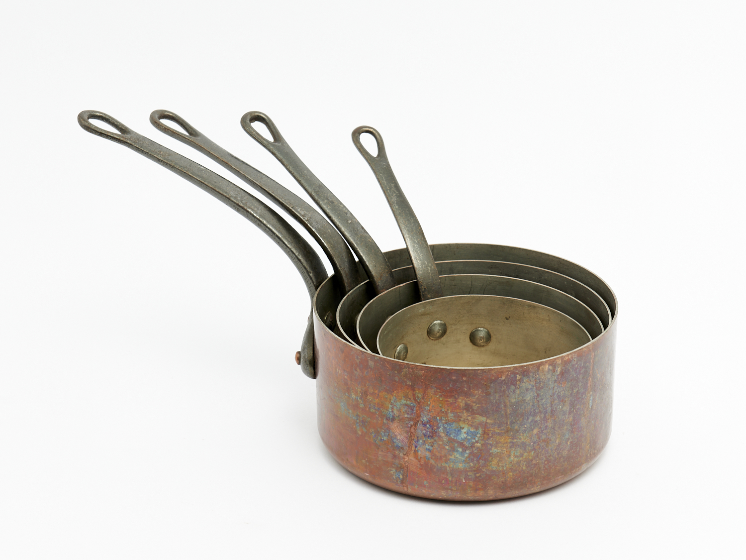 AN ANTIQUE SET OF FOUR HEAVY COPPER AND CAST-IRON HANDLED SAUCEPANS DIA.20CM (LARGEST), LEONARD JOEL LOCAL DELIVERY: MEDIUM