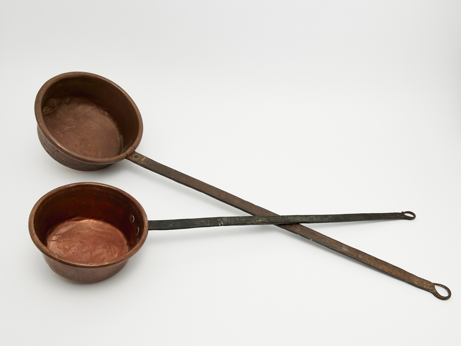 TWO ANTIQUE LONG STEEL HANDLED COPPER COOKING SAUCEPANS (A/F) L.97CM (LONGEST), LEONARD JOEL LOCAL DELIVERY: MEDIUM