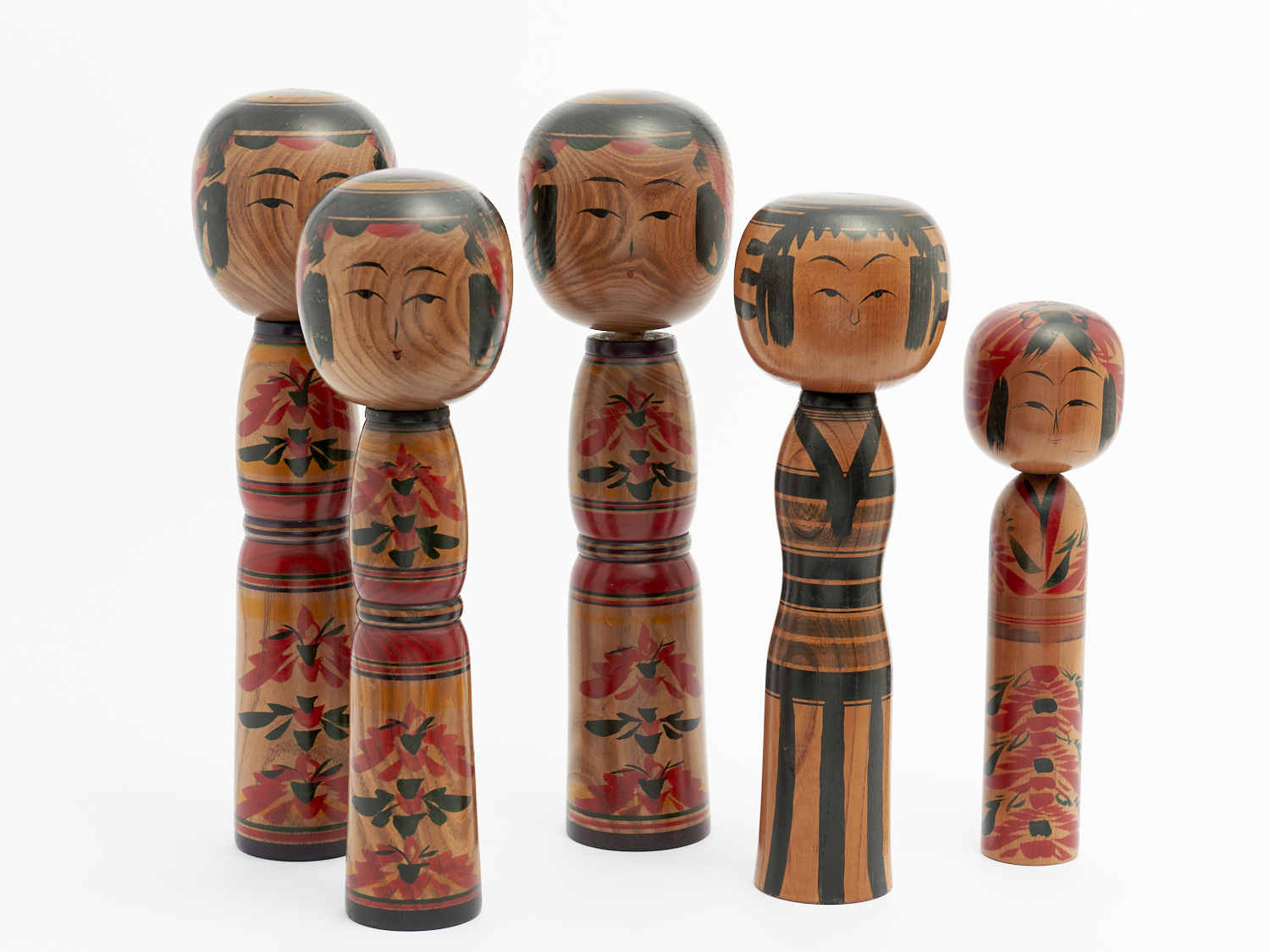 FIVE VINTAGE HAND PAINTED ELM JAPANESE KOKESHI DOLLS H.43CM (TALLEST), LEONARD JOEL LOCAL DELIVERY: MEDIUM