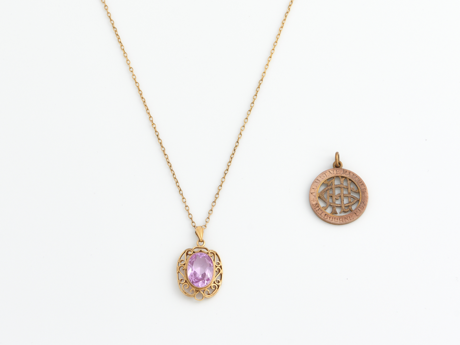 A PASTE SET NECKLACE TOGETHER WITH A CRICKET PENDANT ALL IN 9CT GOLD, 10.4GMS