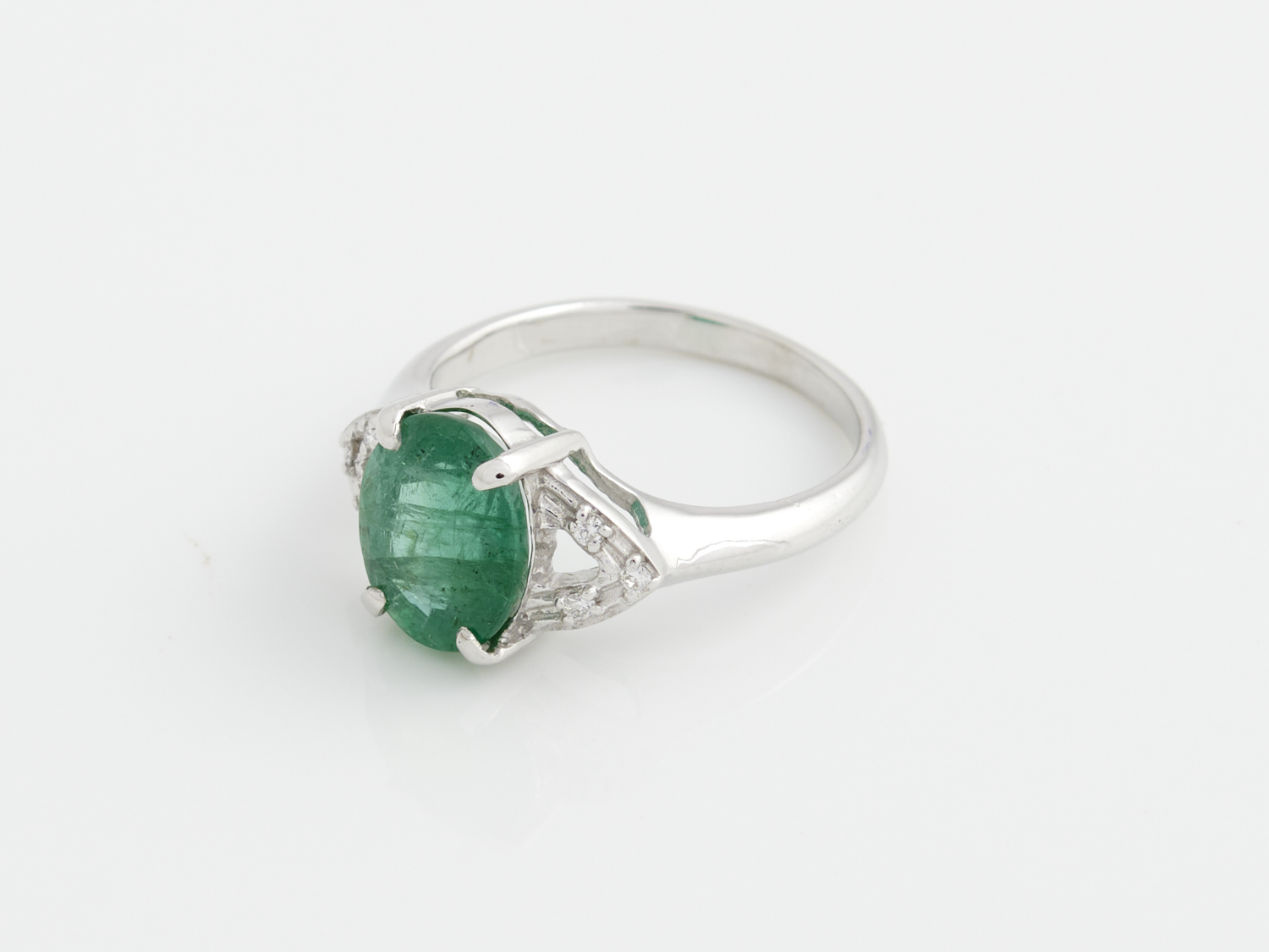 AN EMERALD AND DIAMOND RING IN 18CT WHITE GOLD, THE EMERALD OF 2.50CTS, RING SIZE L, 3.4GMS