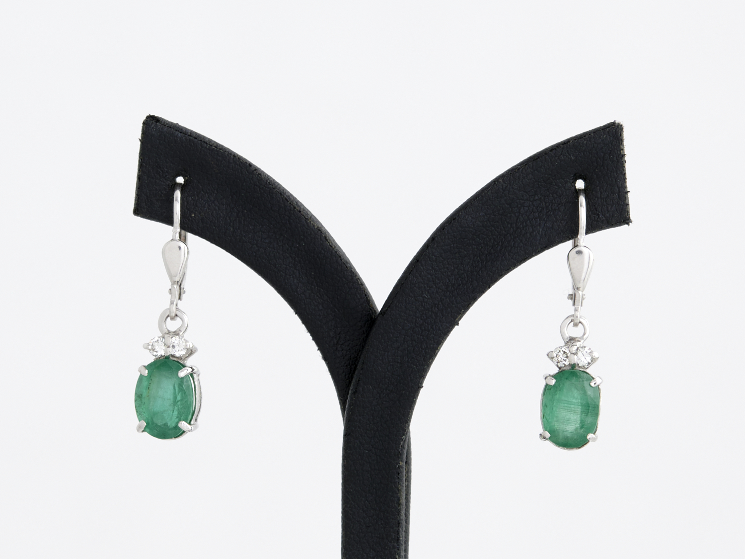 A PAIR OF EMERALD AND DIAMOND DROP EARRINGS IN 18CT WHITE GOLD, TO EUROPEAN HOOK FITTINGS, THE EMERALDS TOTALLING 5.00CTS, LENGTH 30MM