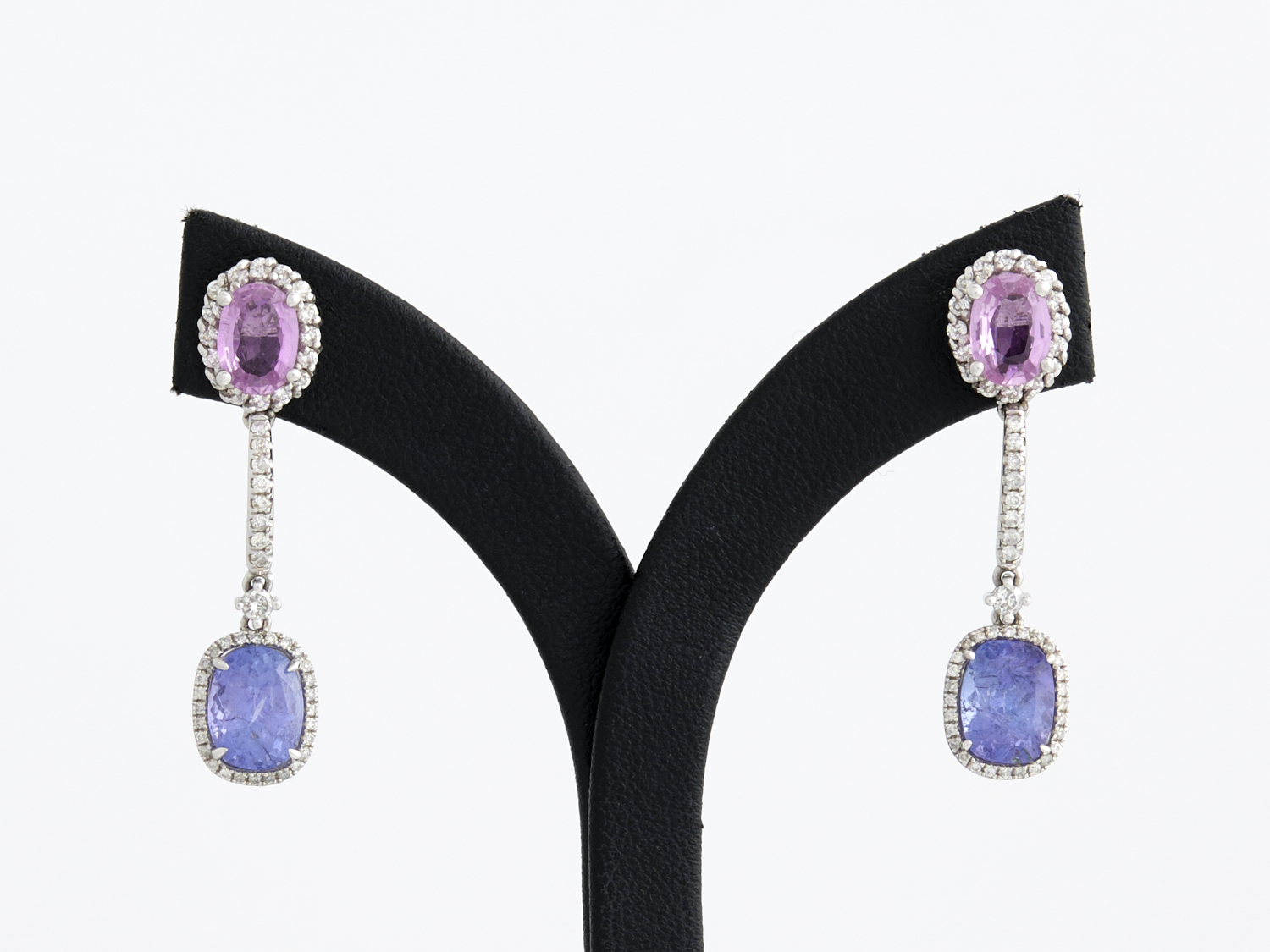 A PAIR OF TANZANITE, PINK SAPPHIRE AND DIAMOND EARRINGS IN 14CT WHITE GOLD, TO POST AND BUTTERFLY FITTINGS, LENGTH 35MM