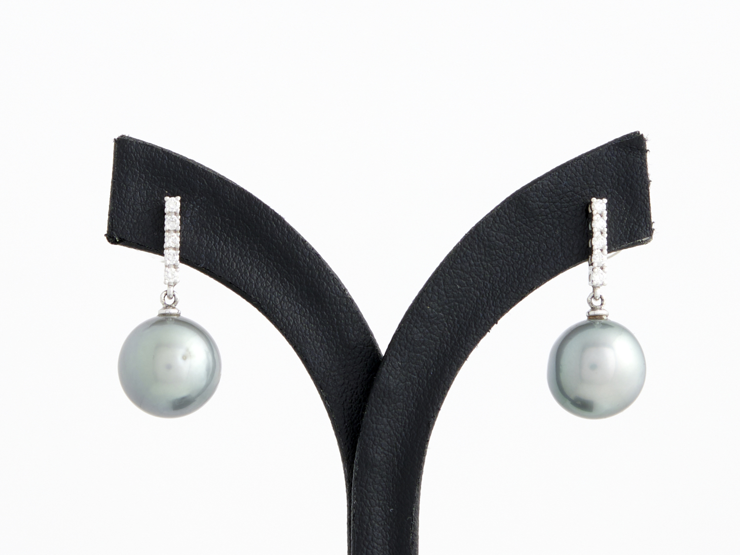 A PAIR OF TAHITIAN PEARL AND DIAMOND EARRINGS IN 14CT WHITE GOLD, TO POST AND BUTTERFLY FITTINGS, THE PEARLS MEASURING APPOXIMATELY 11MM, LENGTH 25MM