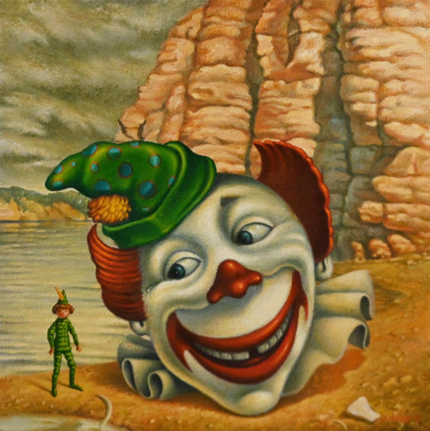 RICKY HOWELL, CLOWN IN A LANDSCAPE 1996, OIL ON CANVAS, SIGNED AND DATED LOWER RIGHT, 30.5 X 30.5CM