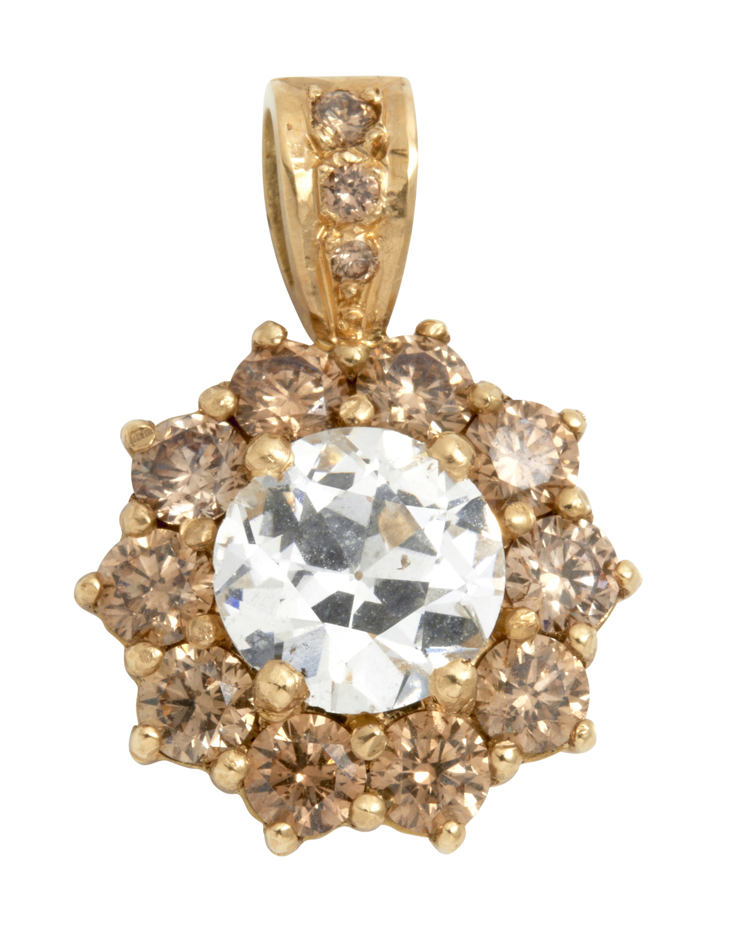 Of cluster design, centring a claw-set old European-cut diamond weighing approximately 1.92 carats, within a surround of ten champagne claw-set brilliant-cut diamonds together weighing approximately 0.80 carats, length approximately 22mm.