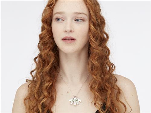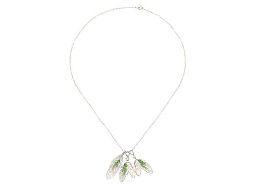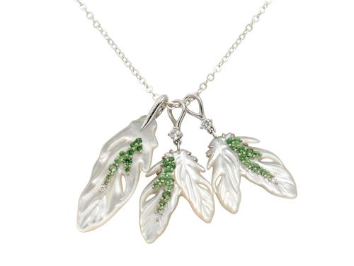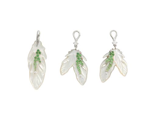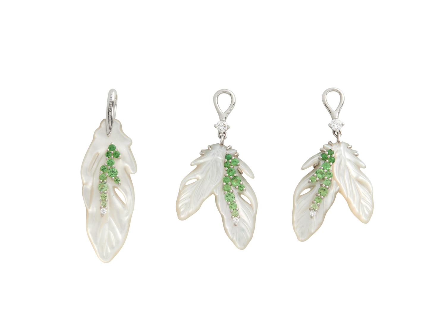 Comprising a carved mother-of-pearl pendant modelled as a feather with brilliant-cut diamond and circular-cut green garnet decoration, together with a pair of carved mother-of pearl-pendants set with green garnet decoration, suspended below a solitaire diamond,
