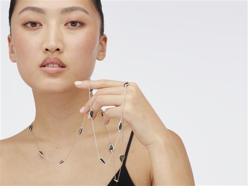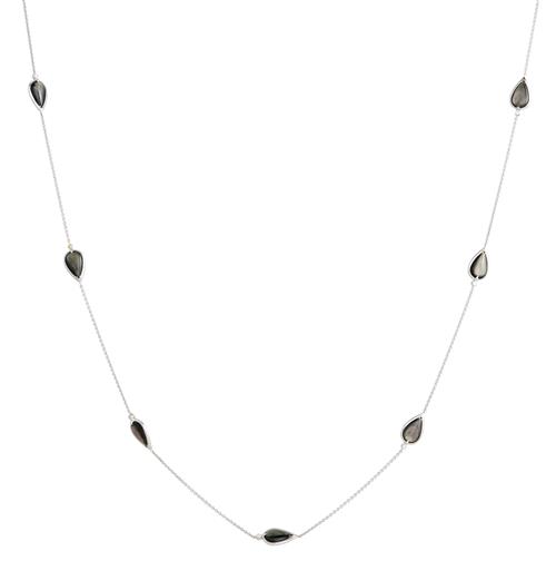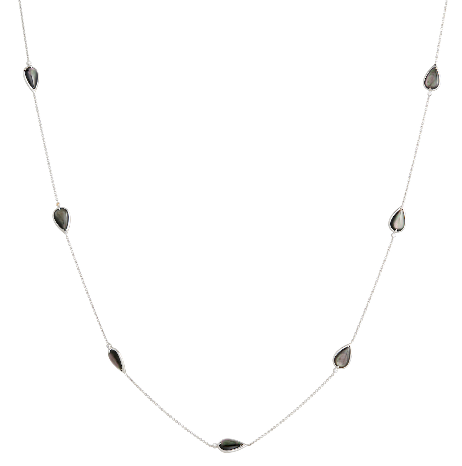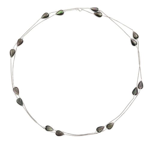 The long chain set at intervals with pear-shaped mother-of-pearl plaques and brilliant-cut diamonds, completed by a parrot clasp,