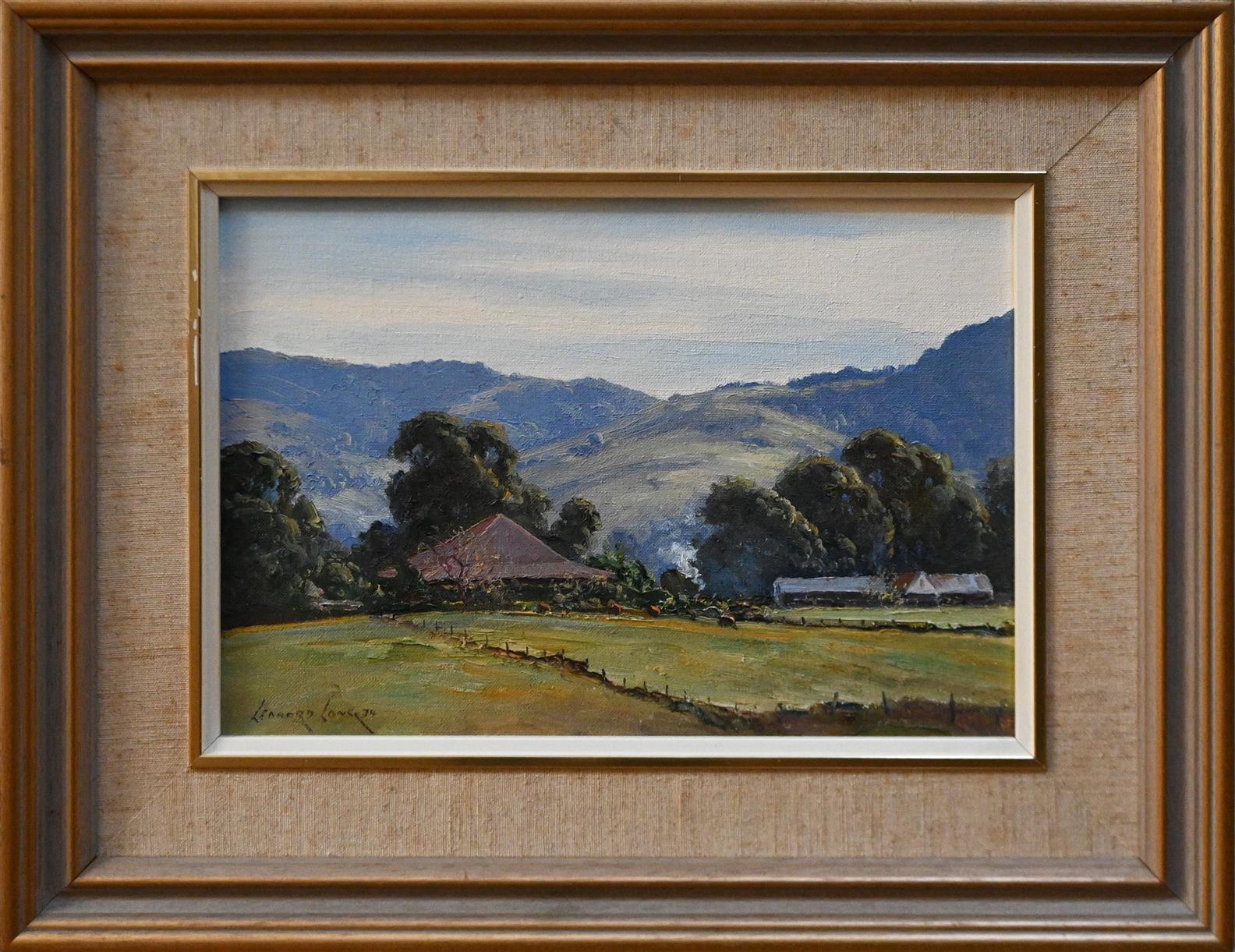 LEONARD LONG, FARM IN THE HILLS, BERRY N.S.W. 1974, OIL ON CANVASBOARD, SIGNED AND DATED LOWER LEFT, 24 X 34CM, FRAME SIZE: 43 X 53CM