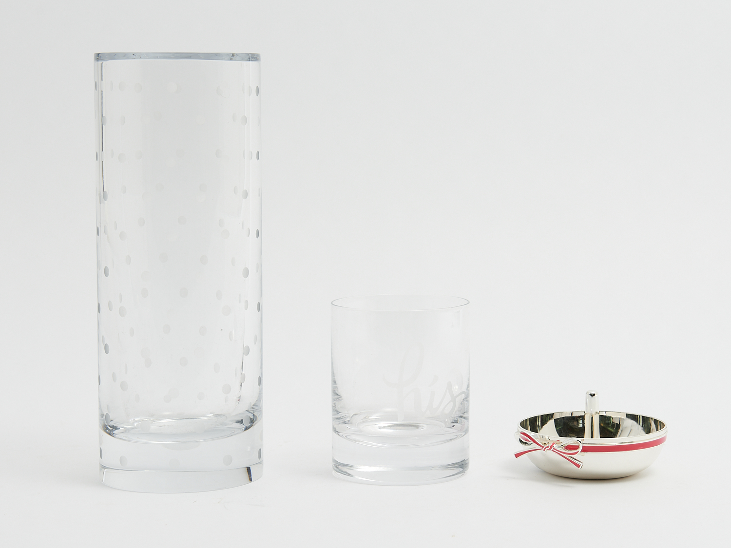 A KATE SPADE NEW YORK SILVER PLATE TRINKET DISH, LARGE ENGRAVED POLKA DOT CRYSTAL VASE AND "HIM" CRYSTAL WHISKEY GLASS, ALL BY LENOX H.25.5CM (TALLEST), LEONARD JOEL LOCAL DELIVERY: MEDIUM