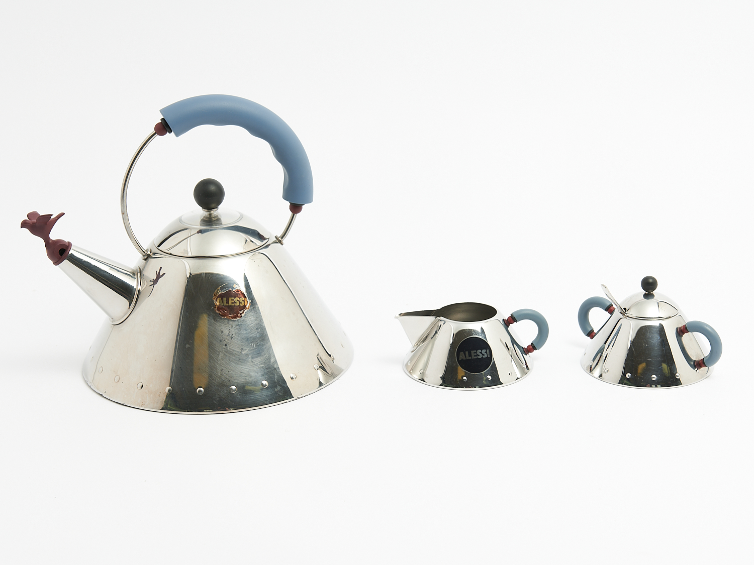 A POSTMODERN ALESSI KETTLE, SUGAR BOWL, CREAMER AND SPOON BY MICHAEL GRAVES, MADE IN ITALY H.23CM (TEAPOT), LEONARD JOEL LOCAL DELIVERY: SMALL