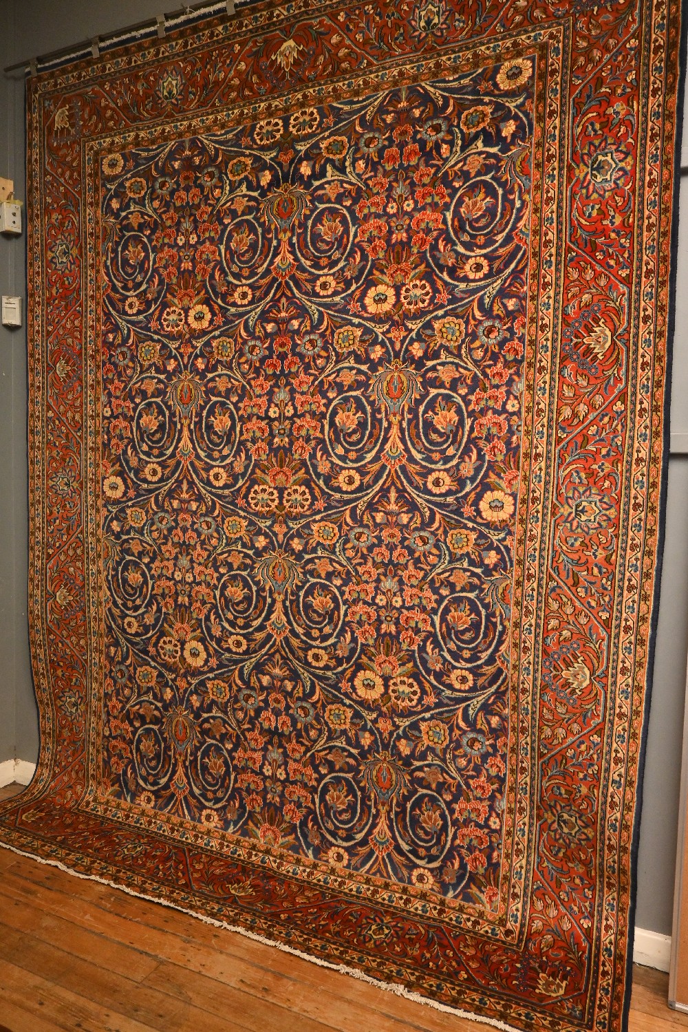 A CIRCA 1970'S SAROUQ GIASABAD CARPET. 100% WOOL, NATURAL DYES, VINTAGE PILE. ALL OVER DESIGN OF ESLIMI SCROLLS, FLORAL SPRAYS OF CARNATION, PLUM BLOSSOM, TULIPS AND PALMETTES ON A ROYAL NAVY BLUE FIELD. BORDER OF TERRACOTTA TONE WITH FLORAL SPRAYS AND PALMETTES. SIZE: 349 X 264 CM. ORIGIN: PERSIA - RRP: $4,500. DOCUMENTATION OF AUTHENTICITY INCLUDED