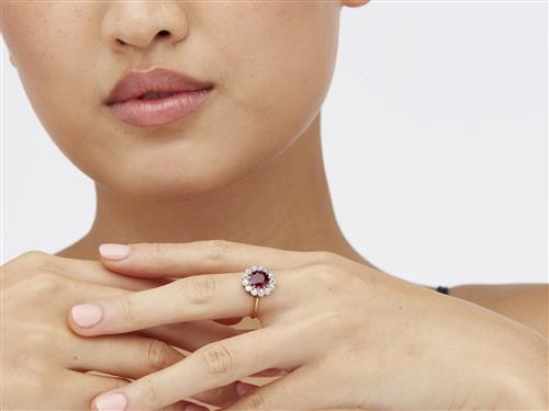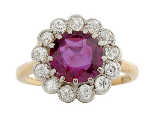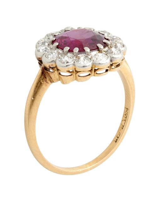 Of cluster design, centring a claw-set circular-cut ruby weighing approximately 1.85 carats, within a surround of thirteen old European-cut diamonds together weighing approximately 0.60 carats, size N.