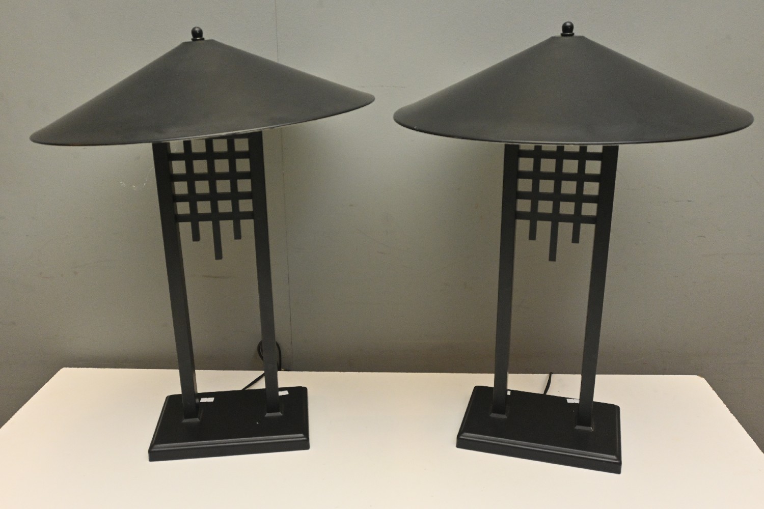 A PAIR OF 1980'S CHINOSERIE STYLE TABLE LAMPS - UNTESTED (A/F) (63H X 46D CM) (LEONARD JOEL DELIVERY SIZE: LARGE)