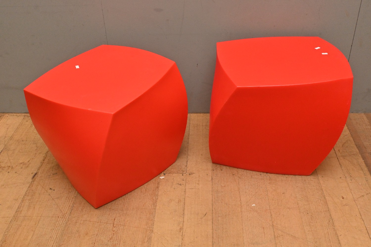 A PAIR OF FRANK GEHRY (HELLER-USA) RED "RIGHT TWIST STOOLS" (43H X 54W X 47D CM) (LEONARD JOEL DELIVERY SIZE: LARGE)