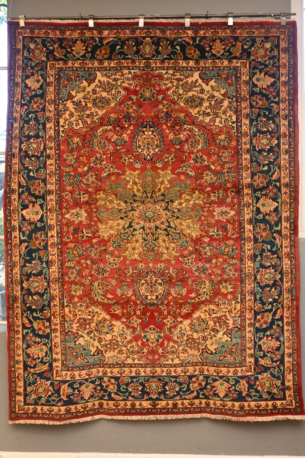 A PERSIAN ISFAHAN NAJAFABAD CARPET. 100% WOOL PILE. HAND-KNOTTED & WITH CLASSIC ISFAHAN DESIGN OF CENTRAL MEDALLION IN CREAM AND FRENCH BLUE AND NAVY BLUE & QUARTERED CORNER MEDALLIONS IN FRENCH BLUE & CREAM. ALL OVER PATTERN OF SHAH ABBAS PALMETTES, FLORAL SPRAYS & SAZ LEAVES ON A RUBY RED FIELD. BORDER OF PALMETTES & SAZ LEAVES ON A PERSIAN BLUE BACKGROUND. SIZE: 277 X 207 CM. ORIGIN: PERSIA - RRP: $3,400. DOCUMENTATION OF AUTHENTICITY INCLUDED