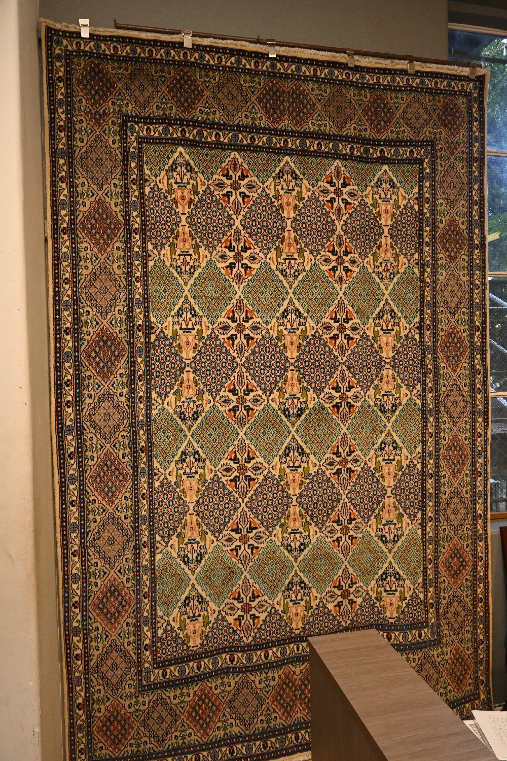 A PERSIAN BIRJAND MOOD CARPET. 100% LAMBS WOOL, HAND KNOTTED SOLID AND DENSE PILE. WITH AN ALL-OVER DIAMOND MINA KHANI DESIGN. IN TONES OF FRENCH BLUE, NAVY BLUE AND LIME GREEN. DIAMOND LATTICE DESIGN BORDER. SIZE: 315 X 208 CM. ORIGIN: PERSIA. RRP: $3,900. DOCUMENTATION OF AUTHENTICITY INCLUDED