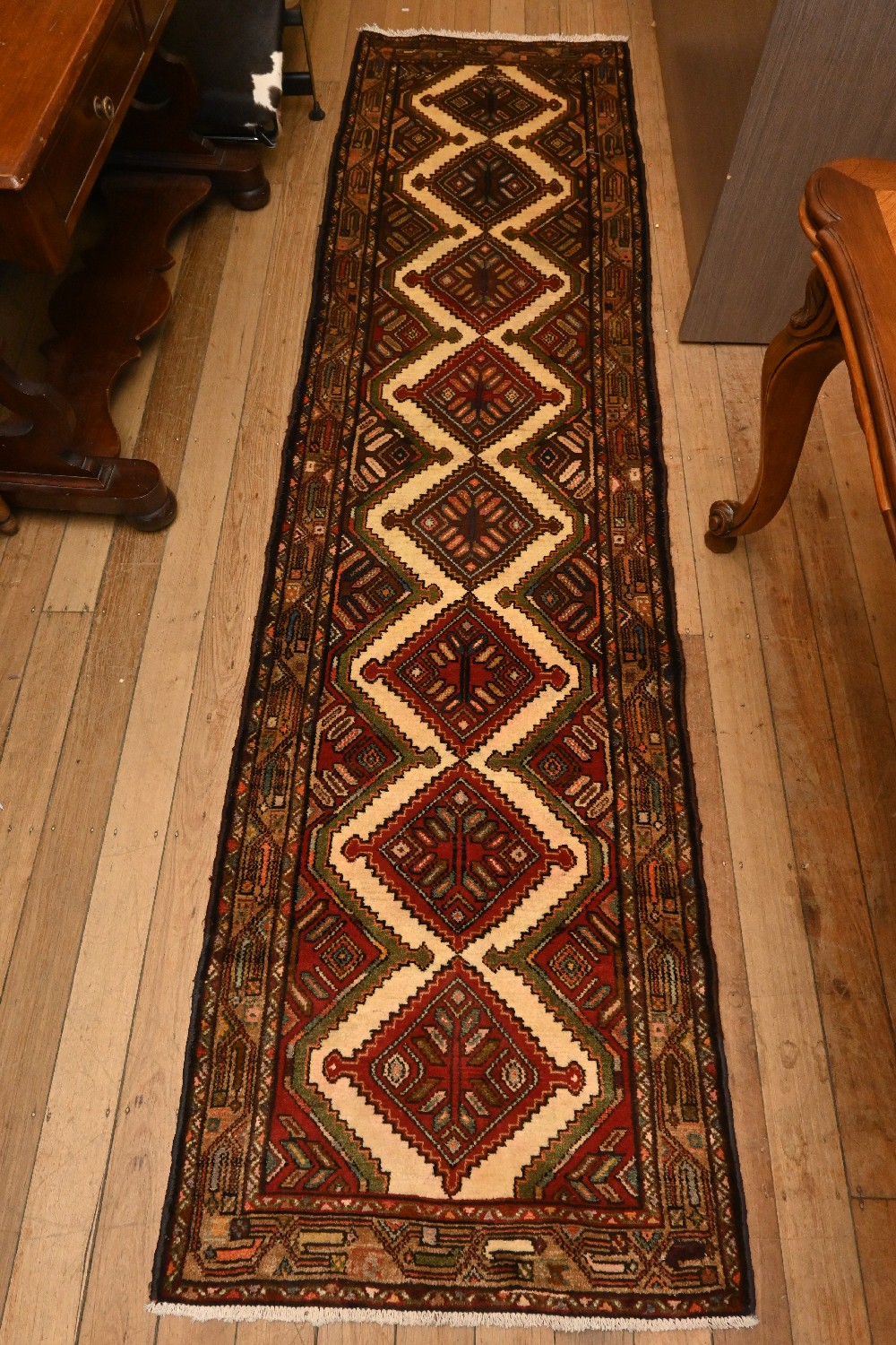A HAND-KNOTTED PERSIAN TRIBAL ZAGEH RUNNER. CONTINUING DIAMOND SHAPED MEDALLIONS IN A NAVY FIELD. BORDER OF TRIBAL MOTIFS. IN TONES OF CREAM SAGE GREEN AND RED. 100% WOOL & NATURAL DYES. SIZE: 315 X 80 CM- RRP $1,100- ORIGIN: PERSIA. DOCUMENTATION OF AUTHENTICITY INCLUDED