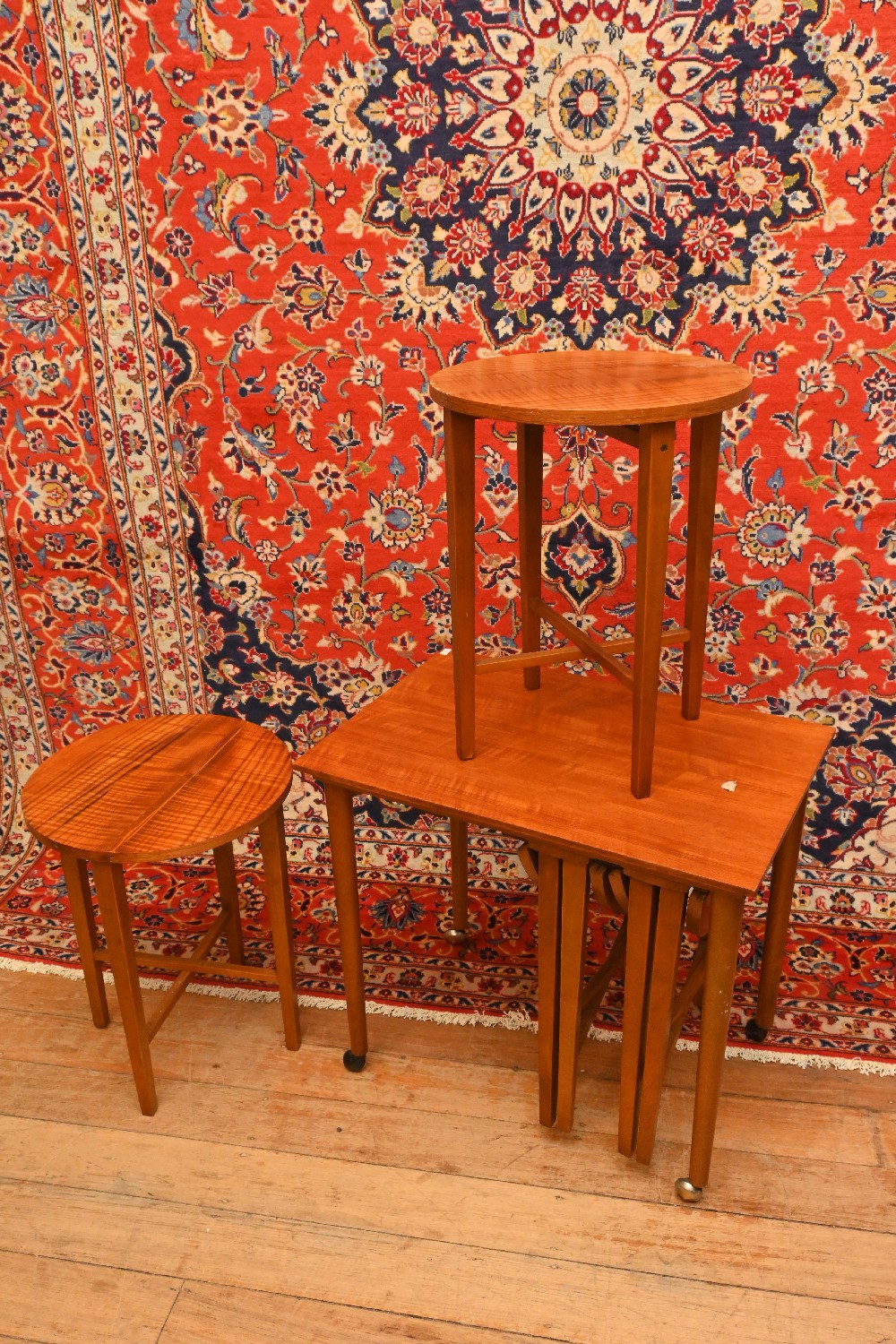 A SET OF FIVE TEAK NESTING TABLES ATTRIBUTED TO POUL HANDEVAD (A/F) (56H X 62W X 42D CM) (LEONARD JOEL DELIVERY SIZE: LARGE)