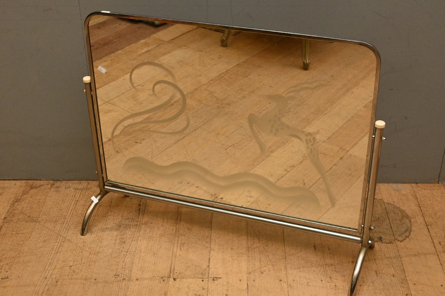 AN ART DECO CHROME AND MIRRORED FIRE SCREEN (A/F) (67H X 76W CM) (LEONARD JOEL DELIVERY SIZE: LARGE)